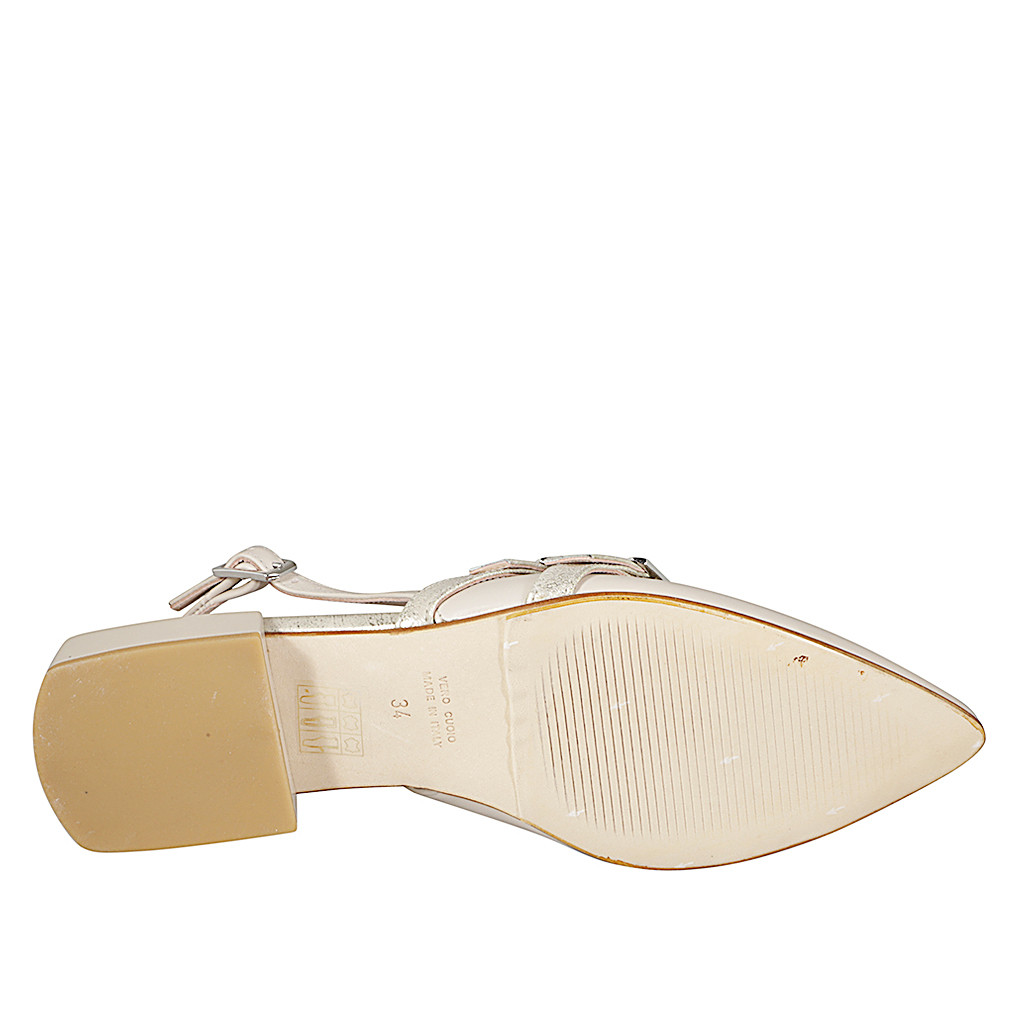 Slingback a punta da donna con fibbie in pelle beige chiaro e pelle laminata platino con tacco 3