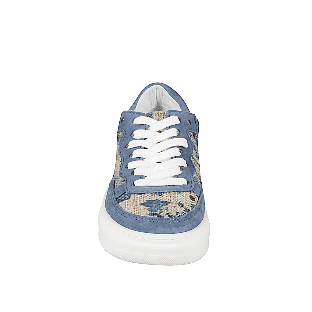 Scarpa stringata da donna con plantare estraibile in camoscio avio e tessuto corda con stampa floreale blu con zeppa 4