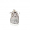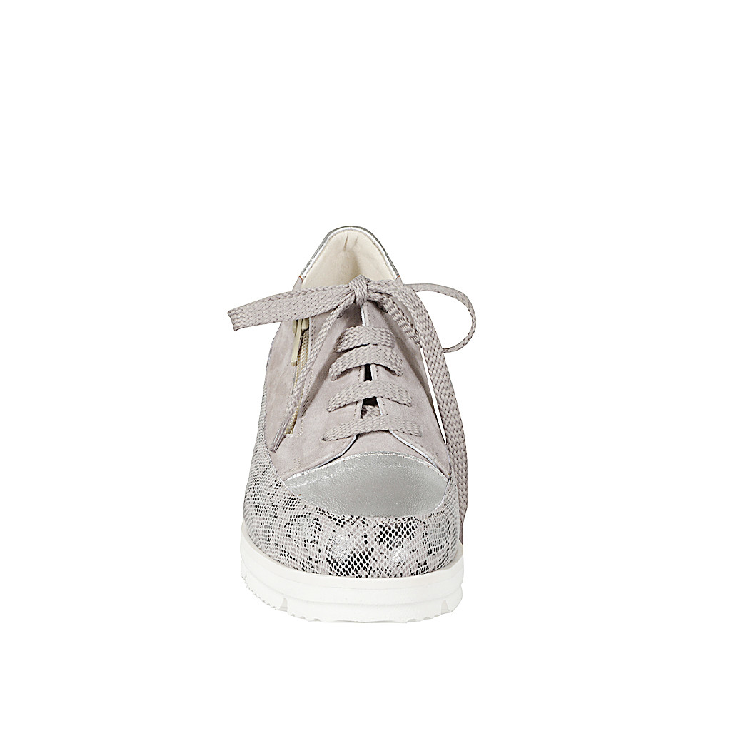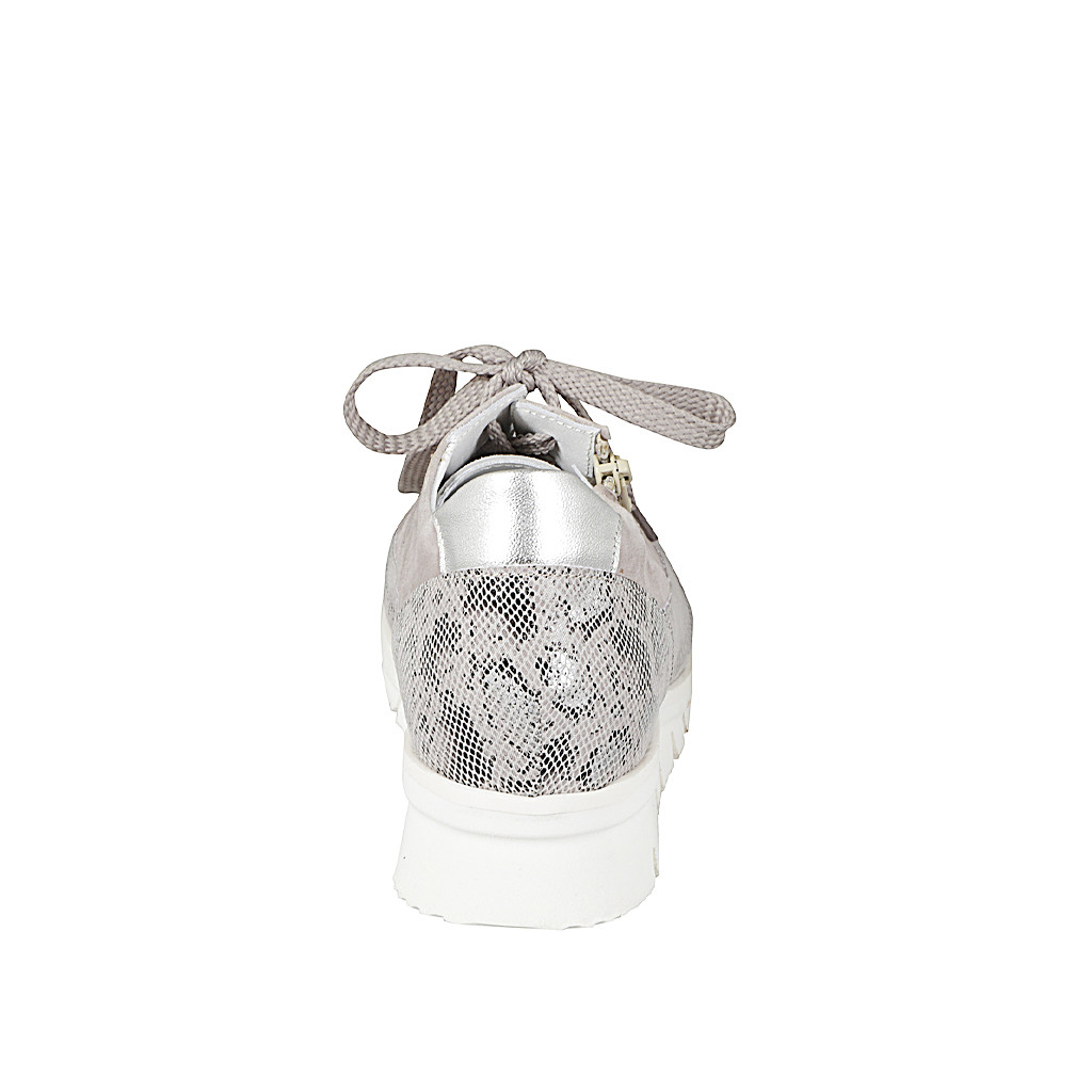 Sneaker stringata da donna con cerniera e plantare estraibile in camoscio grigio, pelle stampata e laminata argento, zeppa 3