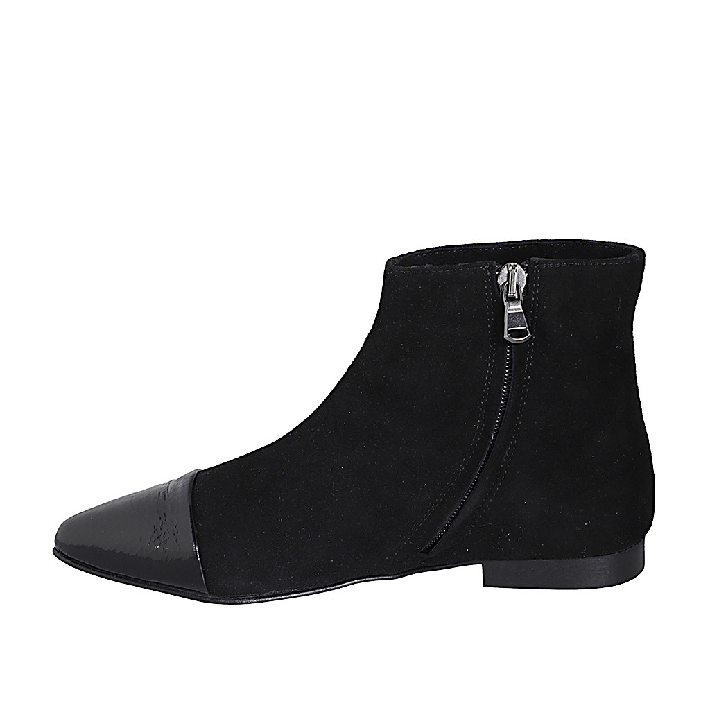 Stivaletto a punta da donna in camoscio nero con cerniera interna e puntale in vernice nera tacco 2 - Misure disponibili: 33, 34, 35, 42, 43, 46