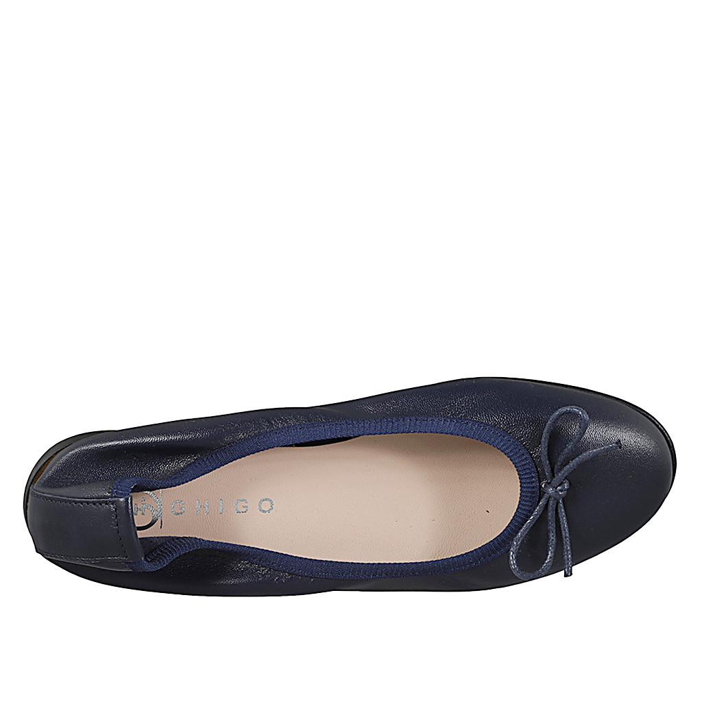Woman's ballerina shoe with bow made of dark blue leather, without lining and with a heel of 1