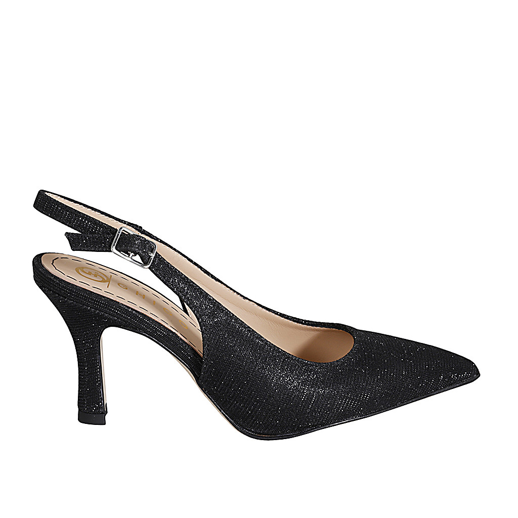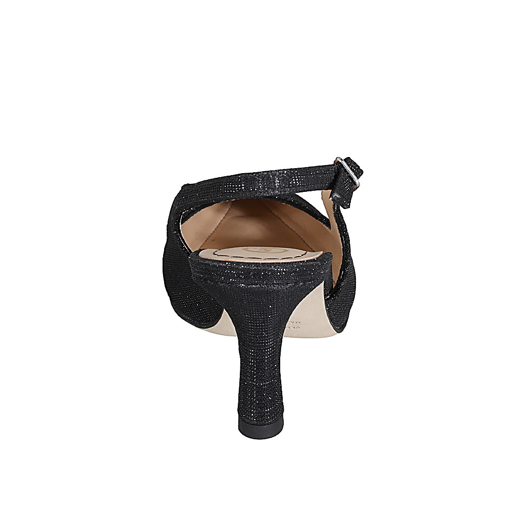 Woman's pointy slingback pump in black laminated glittered fabric heel 7