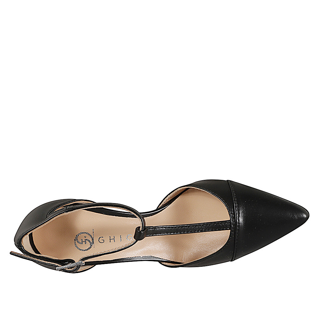 Woman's pointy open T-strap shoe with captoe in black leather heel 7