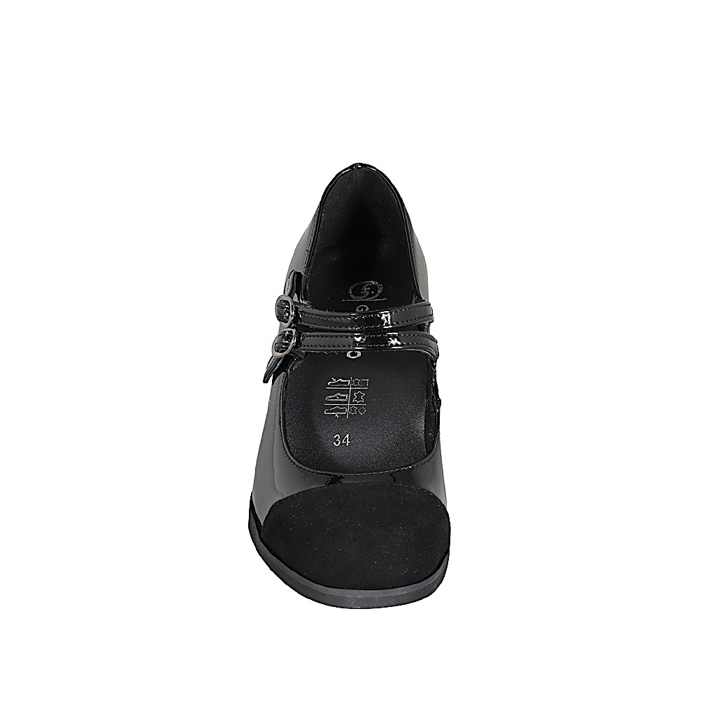 Women's Mary Jane with straps and removable insole in black patent leather and black suede toe cap heel 5