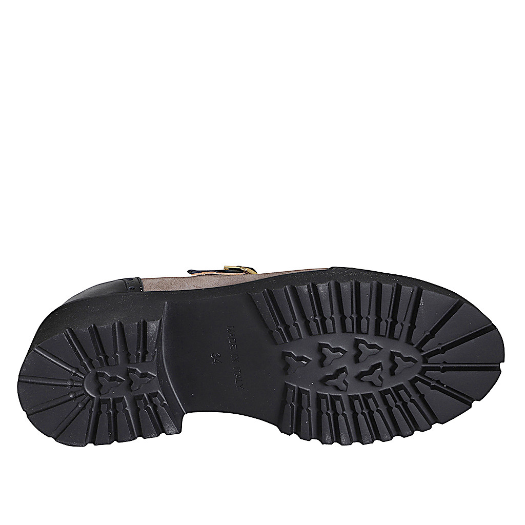 Woman's Mary Jane pump shoe with strap and wingtip in taupe suede and black leather heel 4