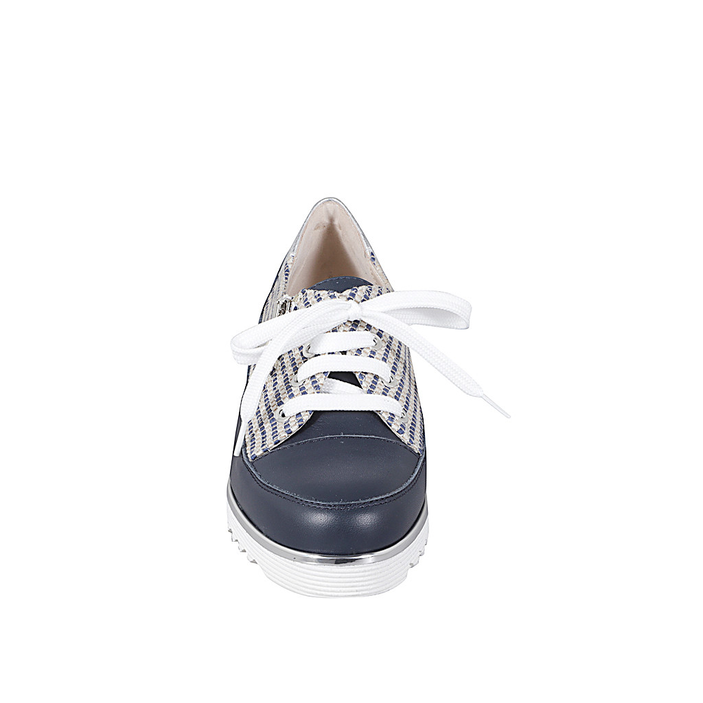 Woman's laced shoe with zipper in dark blue, laminated silver leather, and multicolor fabric with wedge heel 4