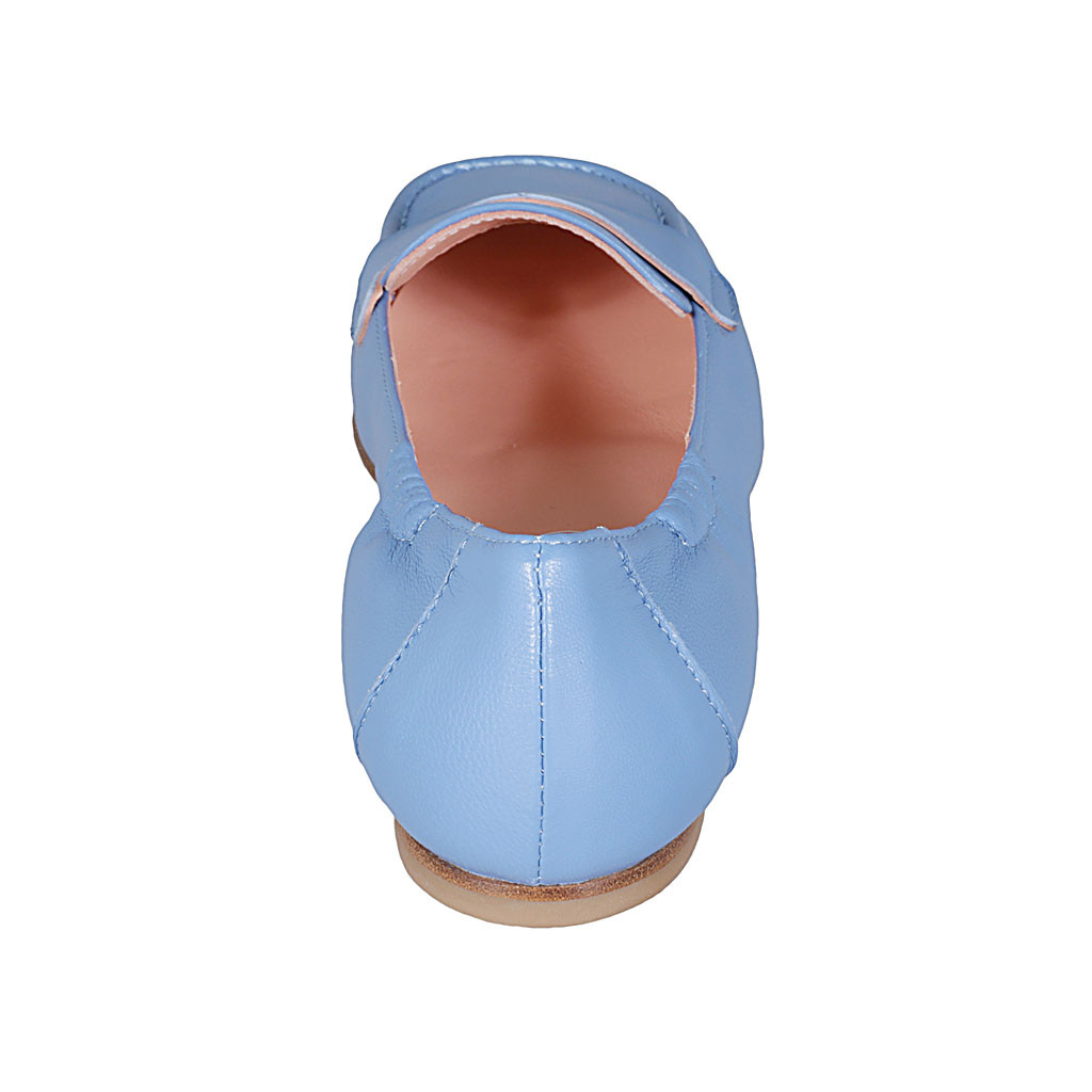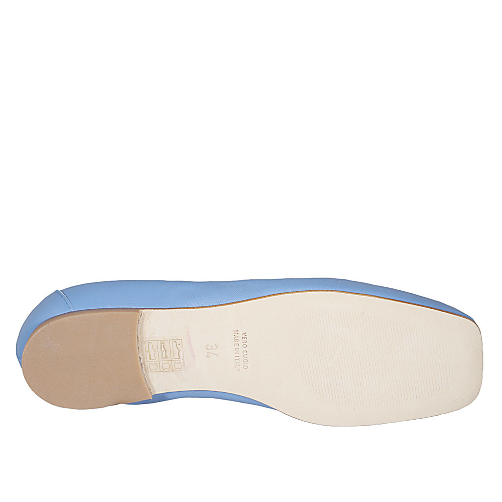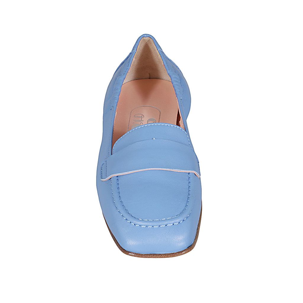 Woman's loafer with squared tip and elastic bands in light blue leather heel 1