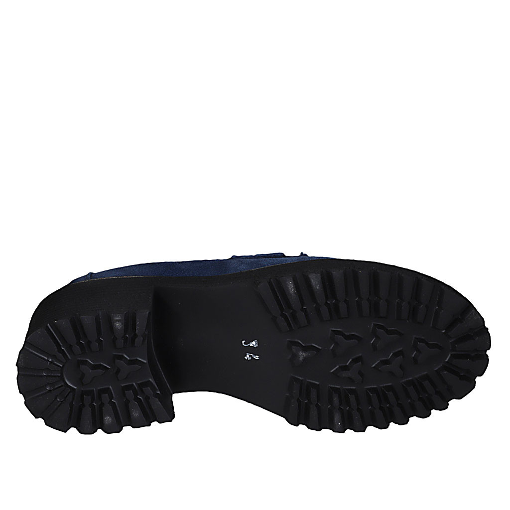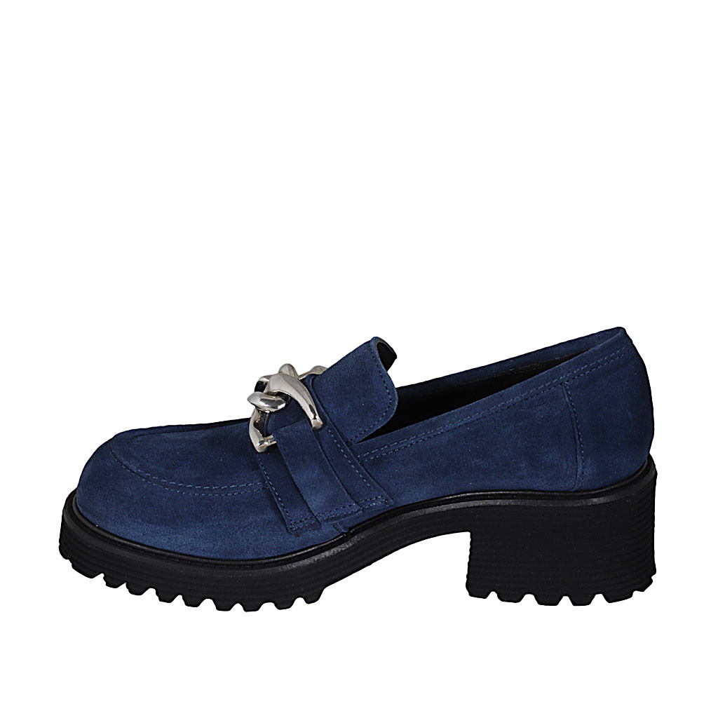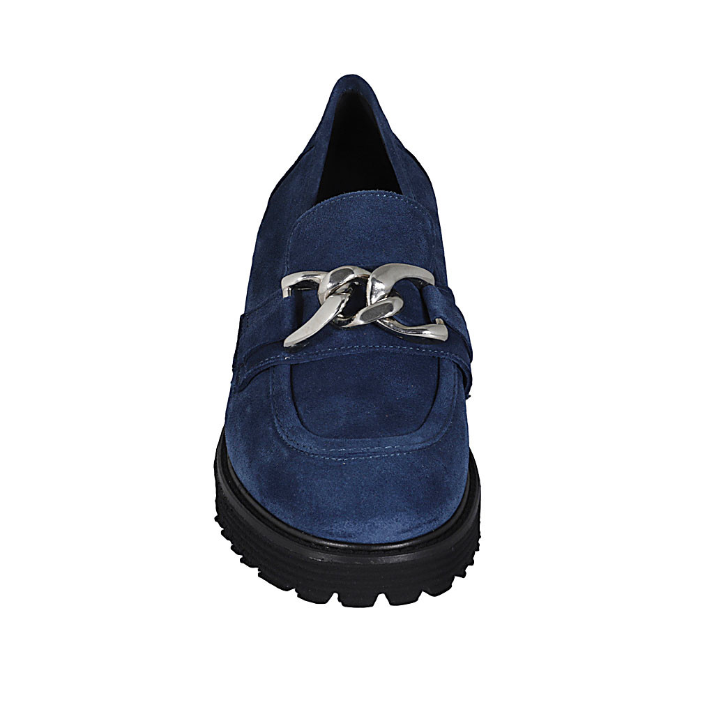 Woman's casual mocassin with chain in blue suede heel 5