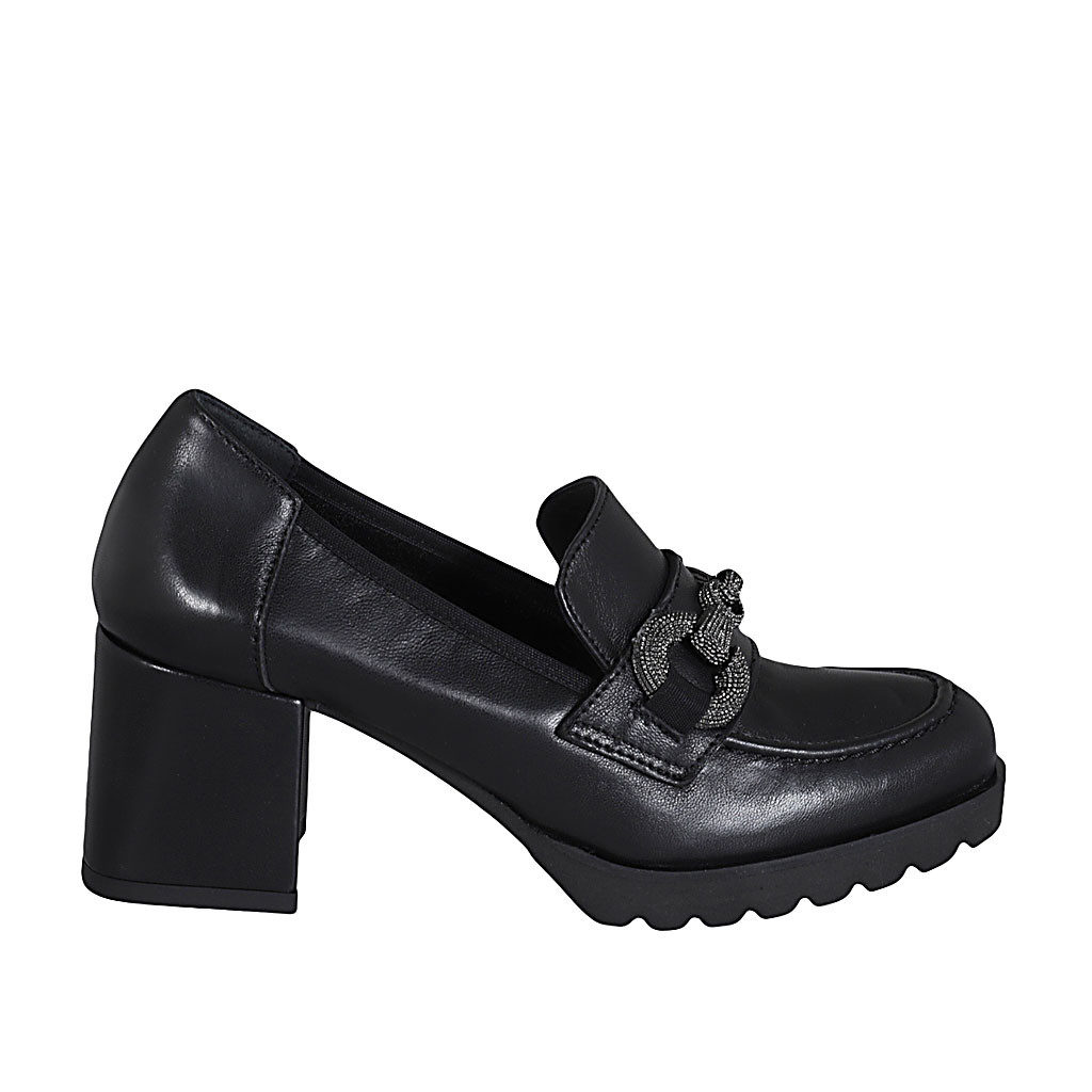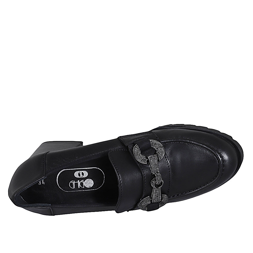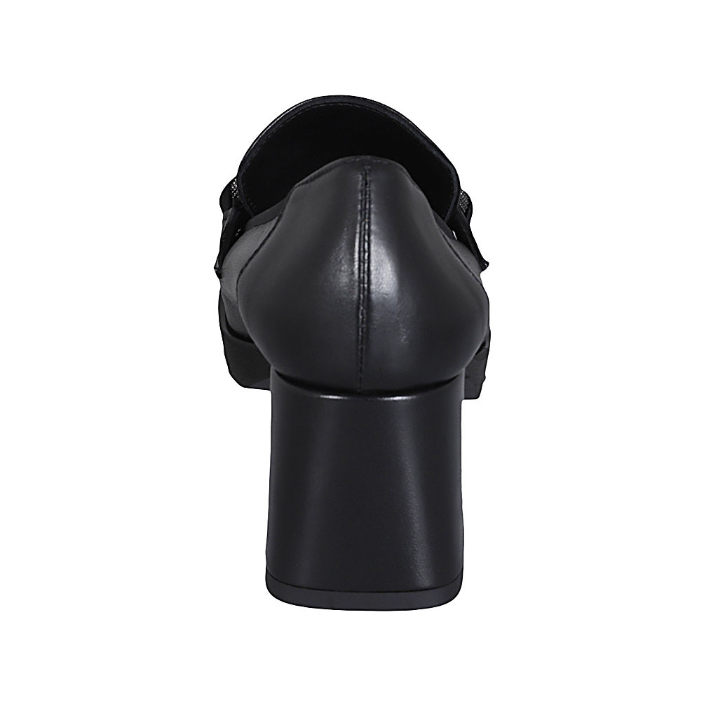 Woman's ankle strap sandal in black leather and patent leather heel 5