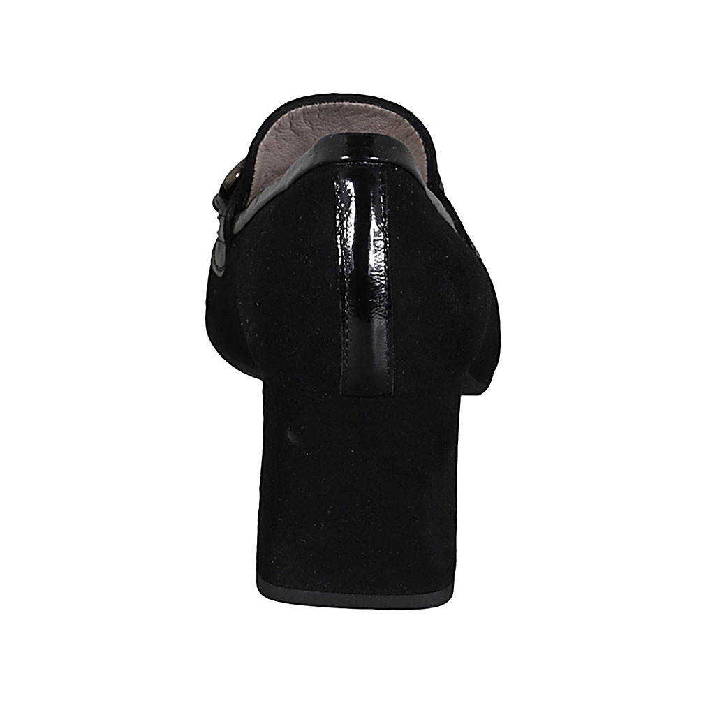 Woman's pointy mocassin with accessory in black suede and patent leather heel 6