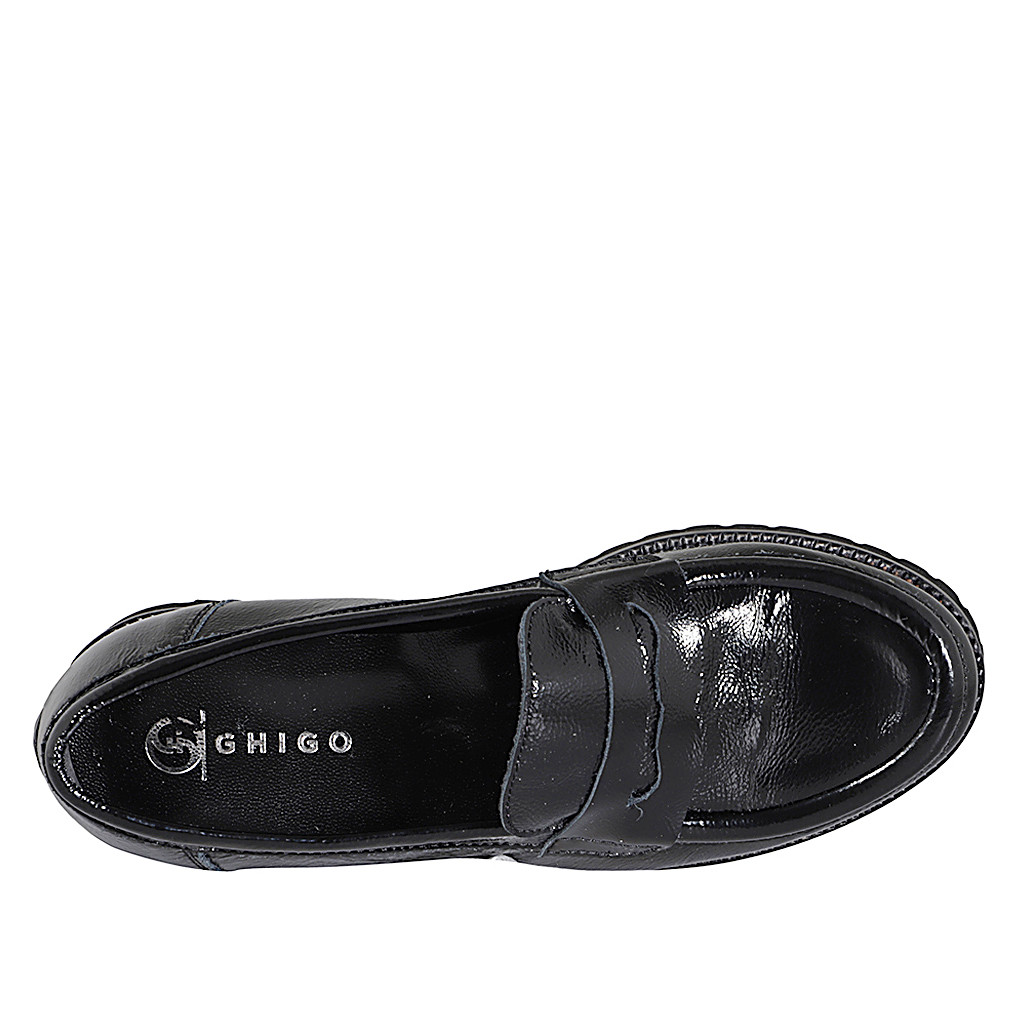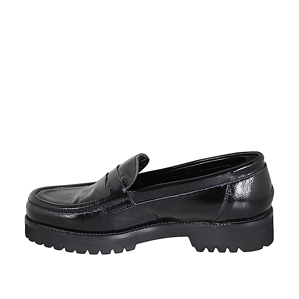 Woman's pointy mocassin with accessory in purple suede and black patent leather heel 3