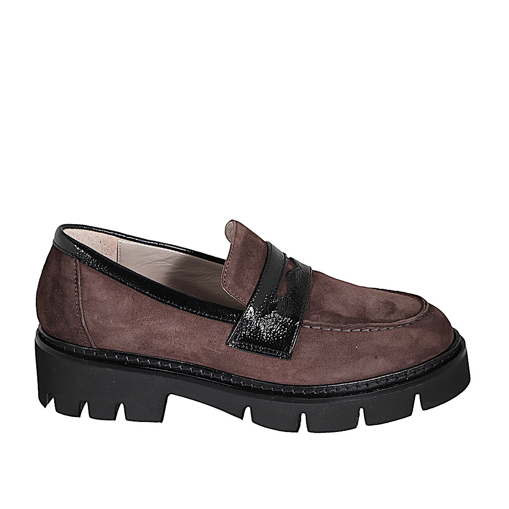 Woman's mocassin in brown suede and black patent leather heel 4