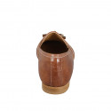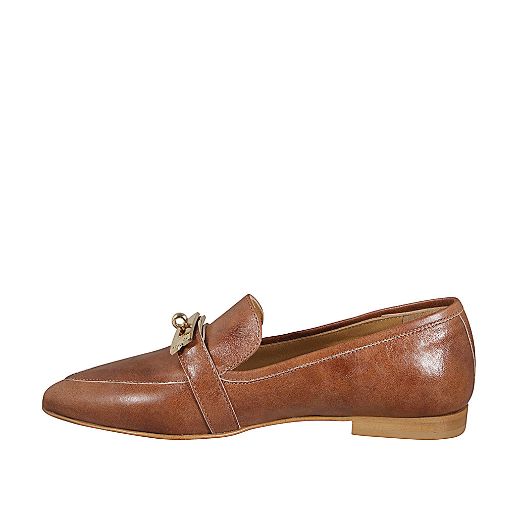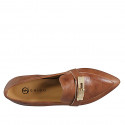 Woman's moccasin with pointed tip and golden accessory in cognac brown leather, heel 2