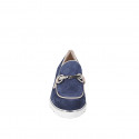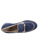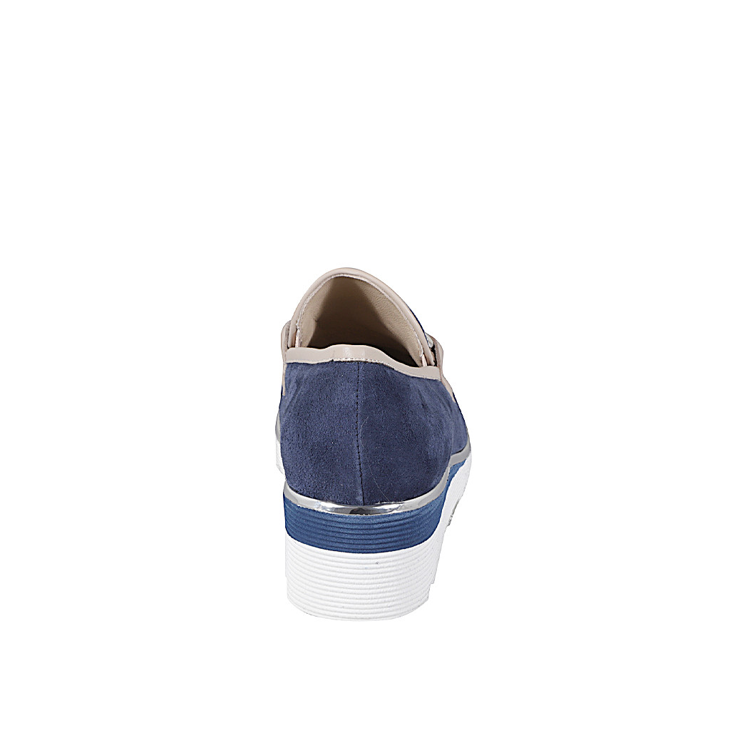 Woman's loafer with wedge heel, elastics, and silver accessory in dark blue suede and details in beige leather wedge heel 4