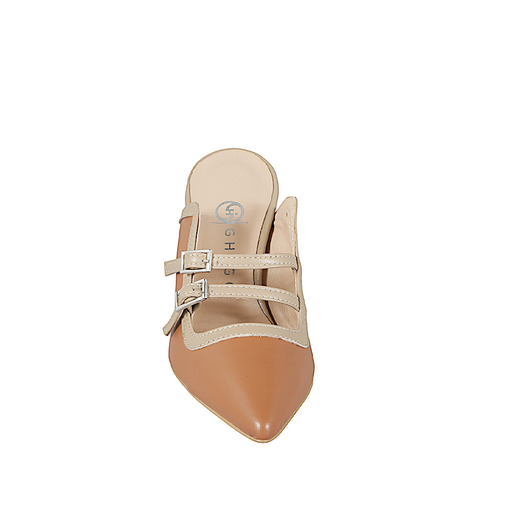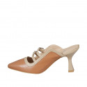 Womans' closed pointy toe mules with double straps in cognac and beige leather and heel 7