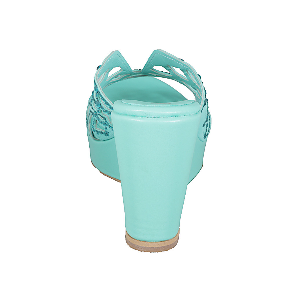 Women's mules in turquoise leather with crystals and rhinestones. Platform and wedge heel 10. Refined and top-quality design!