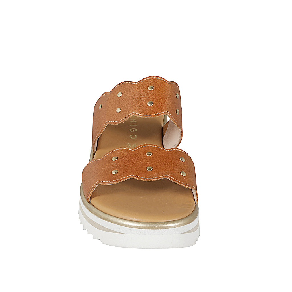 Woman's open mules with 2 bands with elastic and studs in cognac leather with a wedge heel 5
