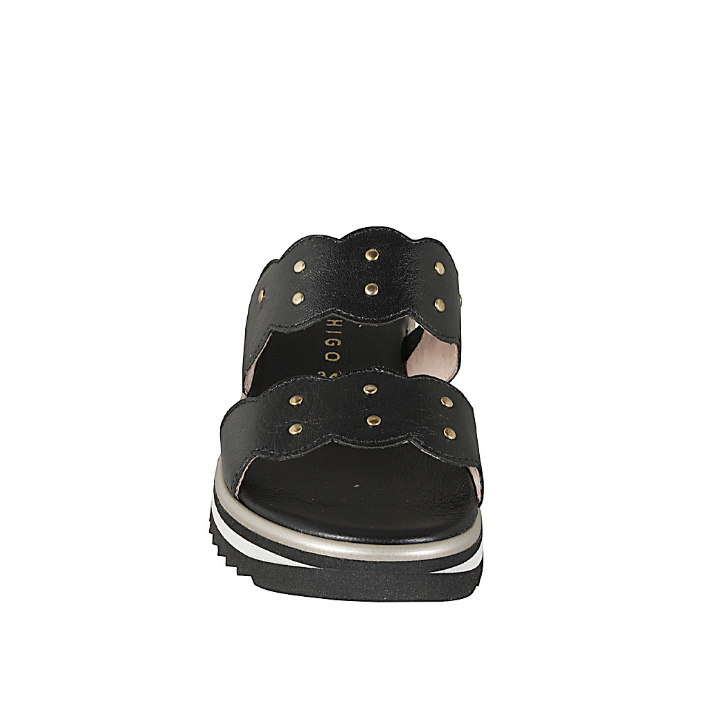 Woman's open mules with 2 bands with elastic and studs in black leather with a wedge heel 5