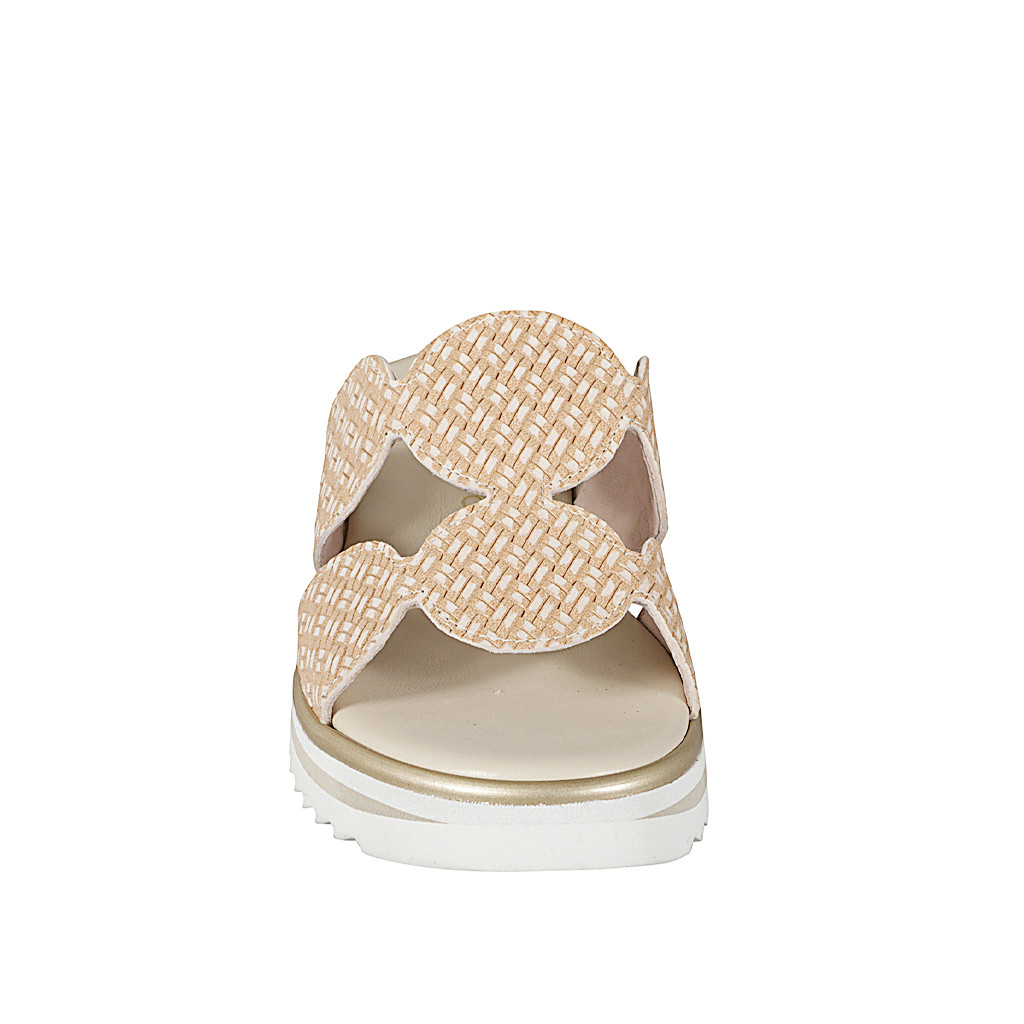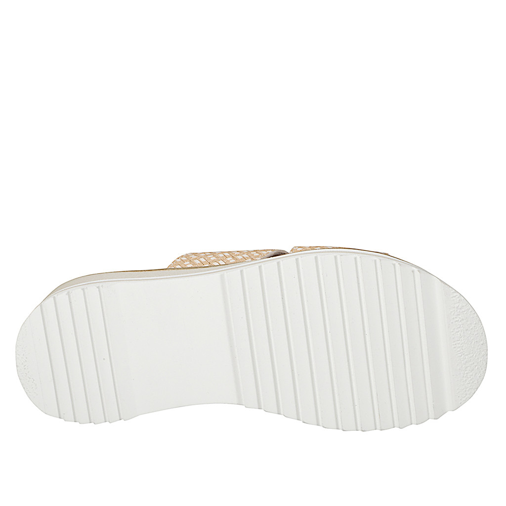 Woman's open mules with 2 bands with geometric design and elastic in beige and white braided leather with wedge heel 5