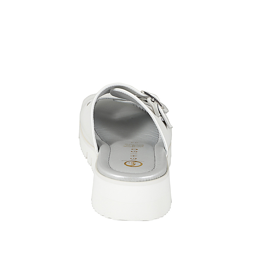 Woman's open mules with an insole in memory foam and double adjustable buckle straps in white leather wedge heel 3
