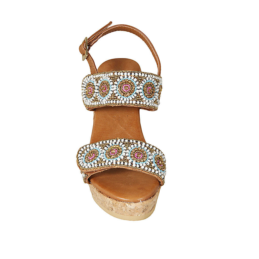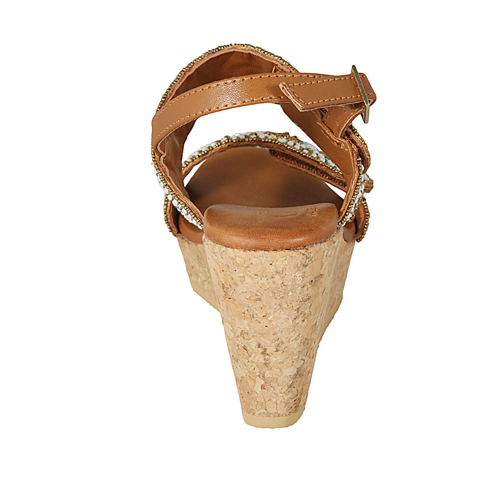 Woman's sandal in cognac brown leather with velcro straps, beads and wedge heel 9