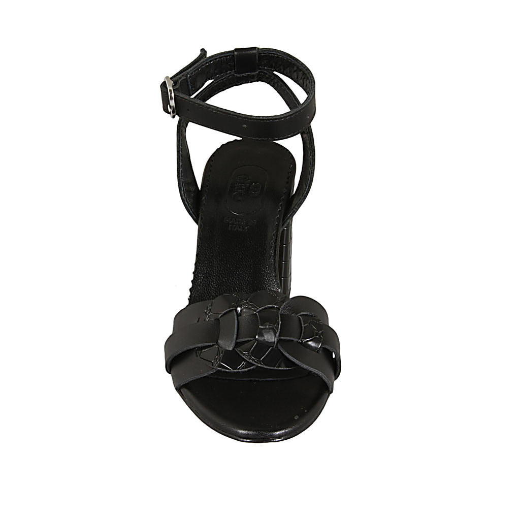 Woman's sandal with rhinestones in black leather and suede heel 1