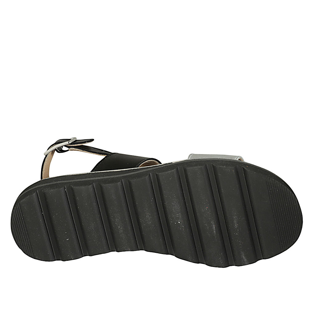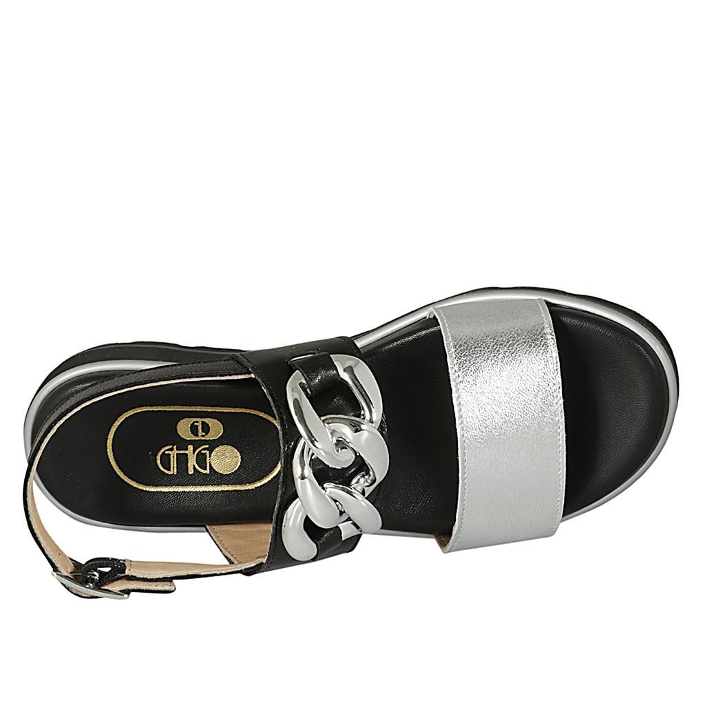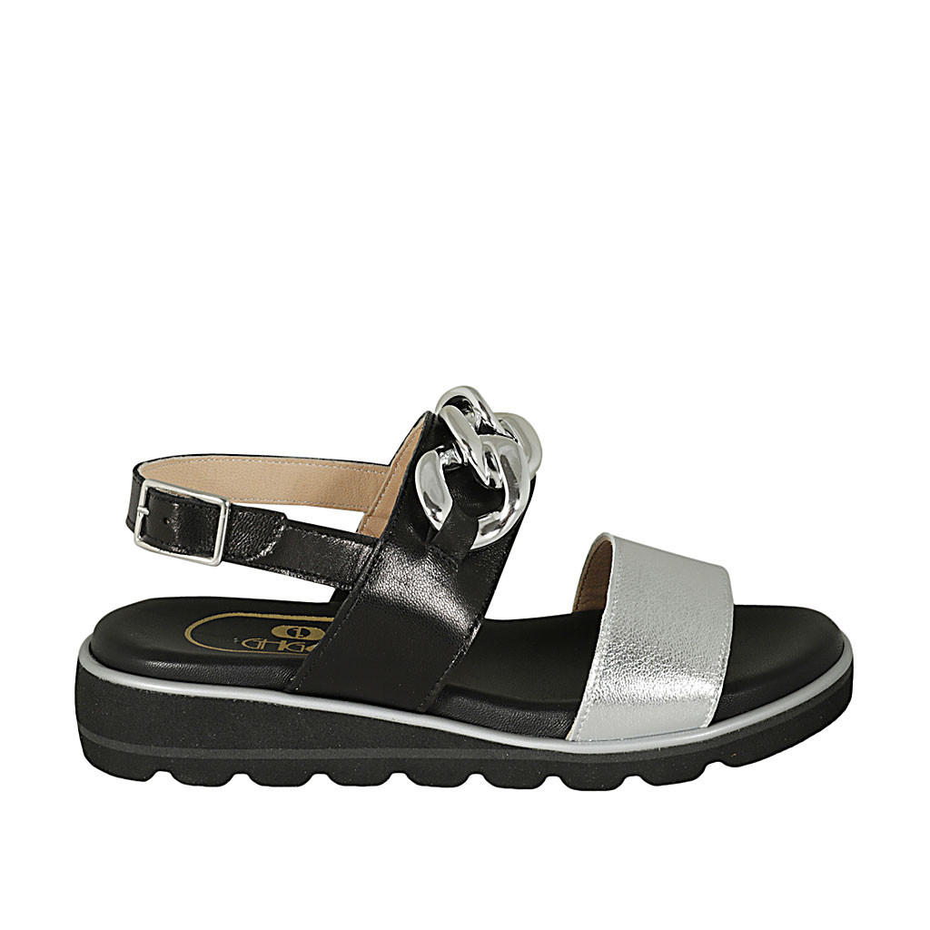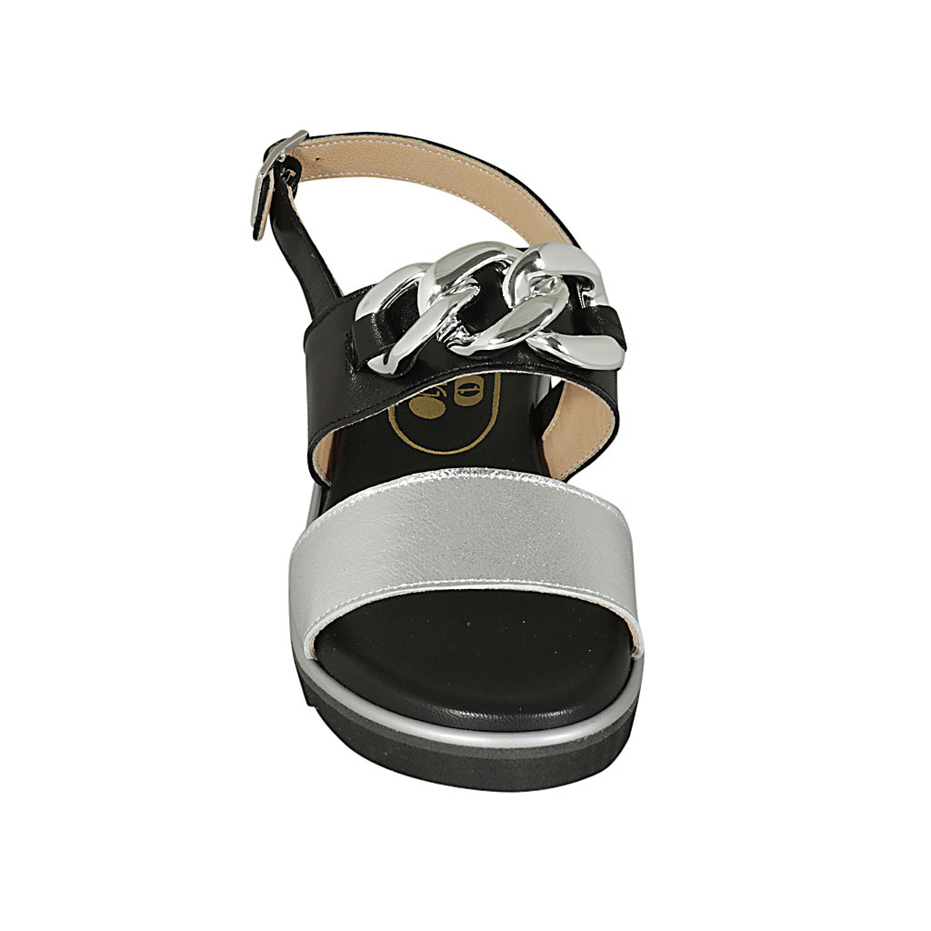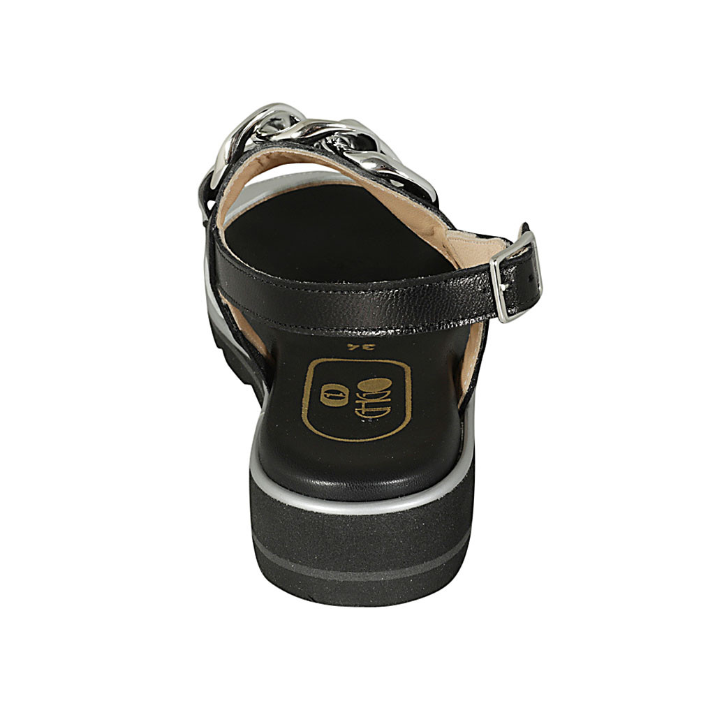 Woman's sandal with chain in black leather and silver laminated leather wedge heel 3