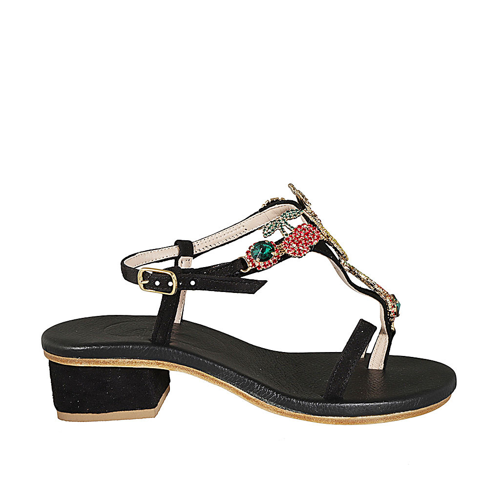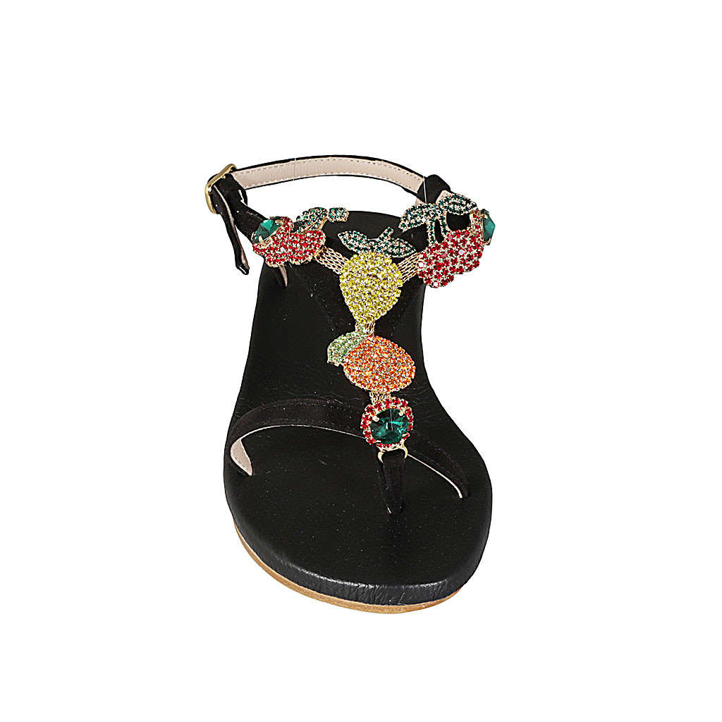 Woman's thong sandal in black suede with fruit-shaped crystal rhinestones and strap heel 4