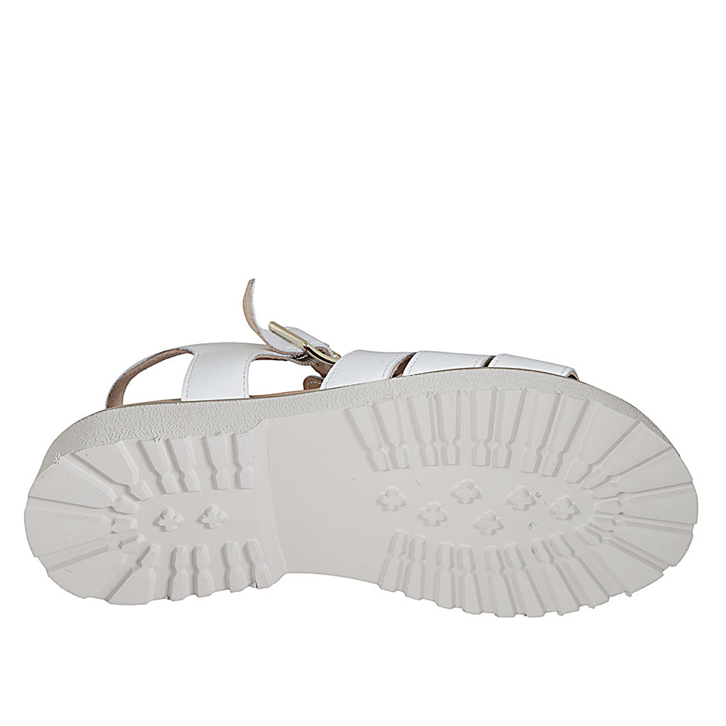 Woman's sandal with strap and platform in white leather and multicolored fabric heel 7