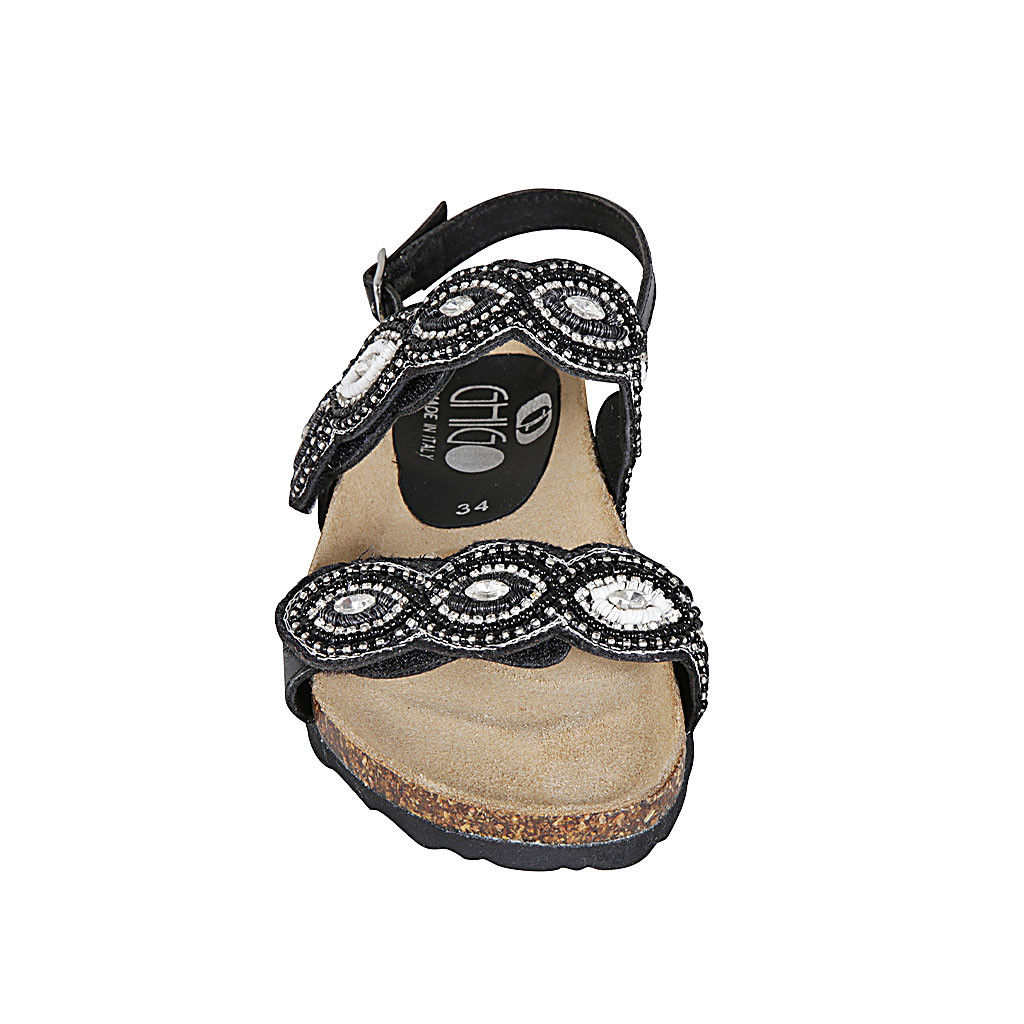 Woman's sandal in black leather with velcro straps, beads and rhinestones wedge heel 2