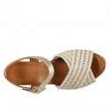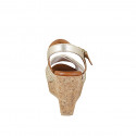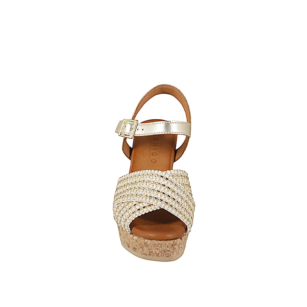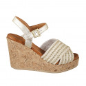 Woman's open shoe with platform and wedge heel in cork in dark blue suede and drwsrtring with...