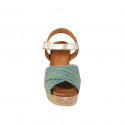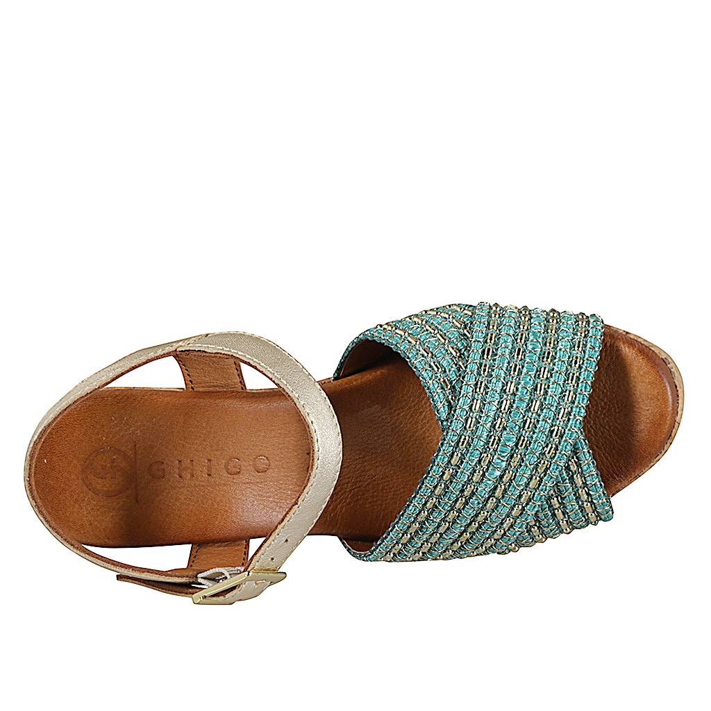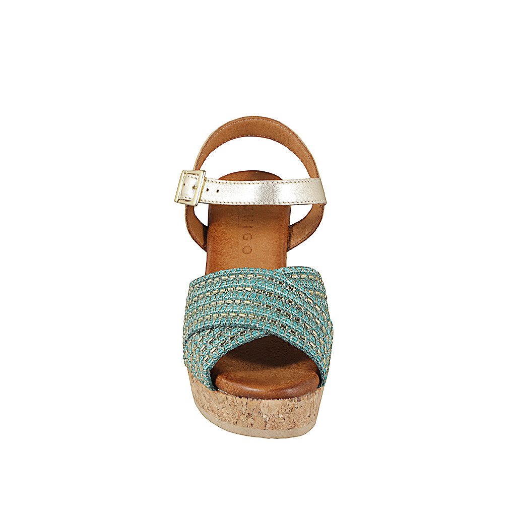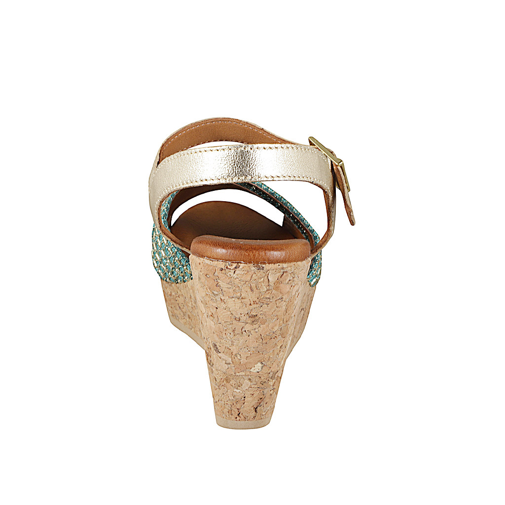 Women's sandal in laminated platinum leather and turquoise fabric with small inserts in platinum and beads, wedge heel 9