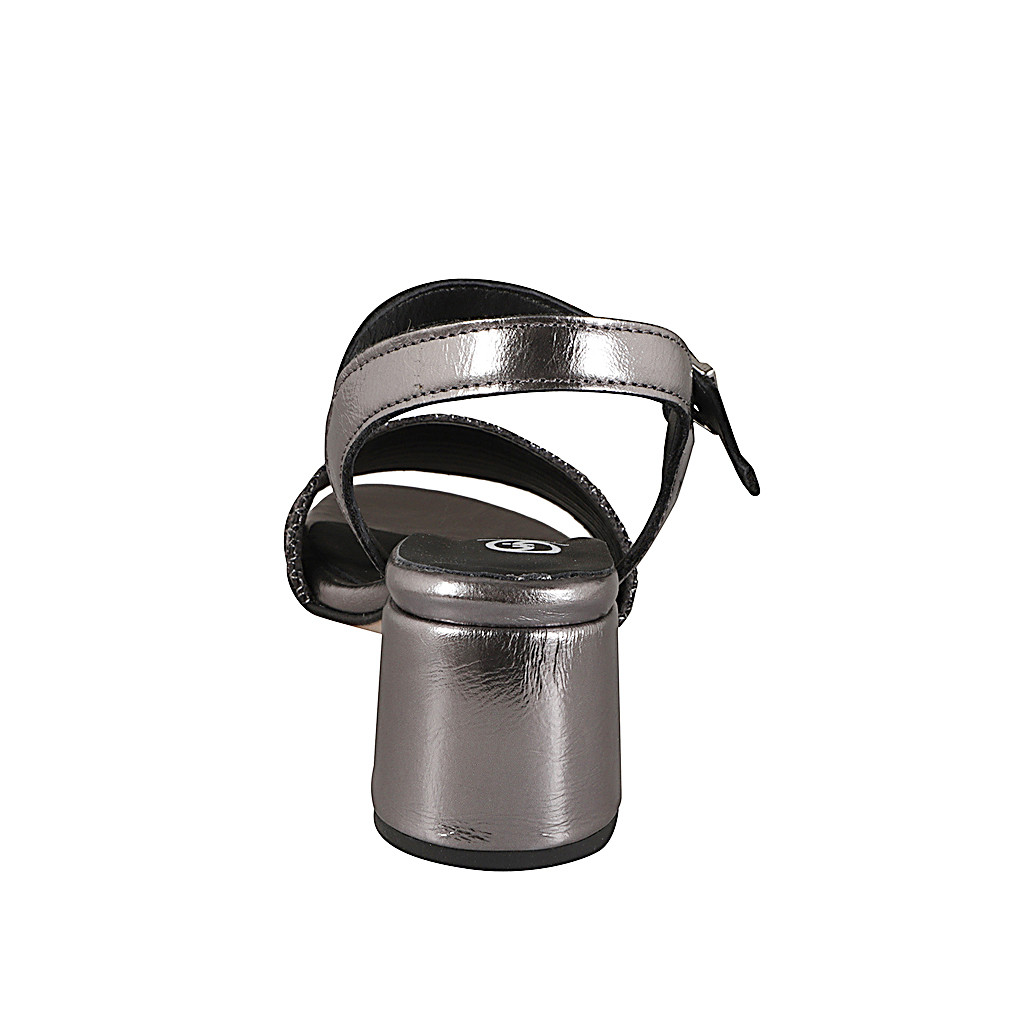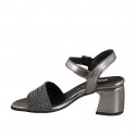 Women's sandal with ankle strap in dark grey laminated leather and grey fabric with silver inserts, heel 6