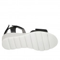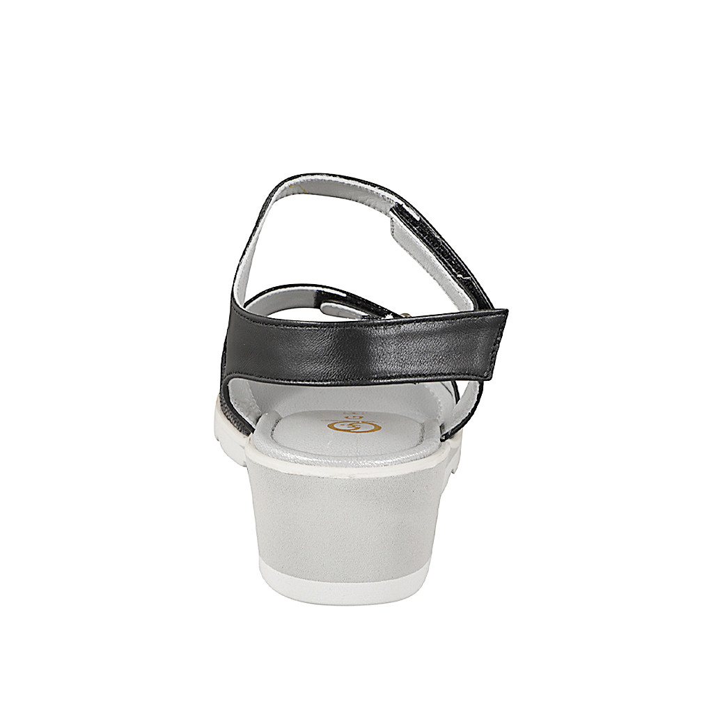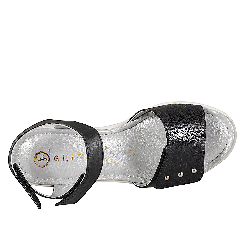 Women's sandal with memory foam footbed and Velcro strap and band, in black leather and printed leather with studs, wedge heel 5