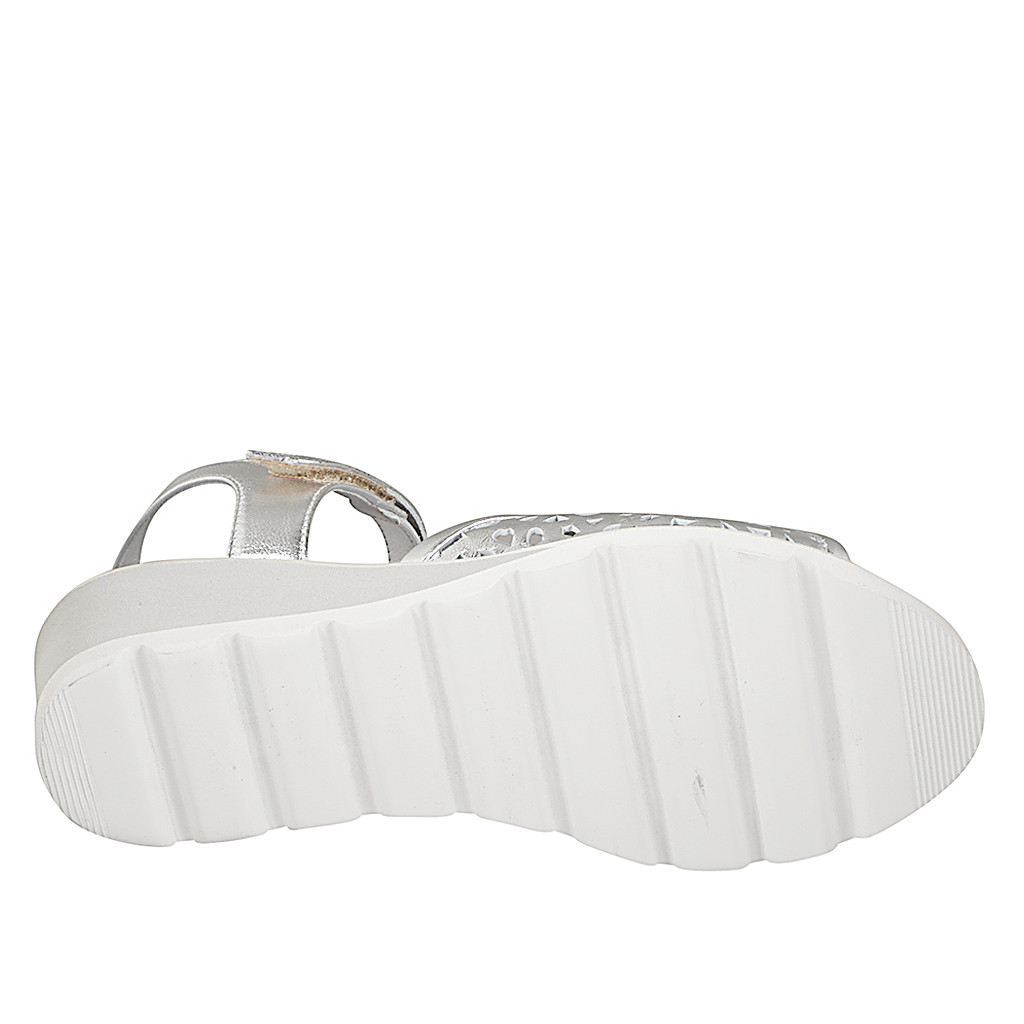 Women's sandal with memory foam footbed and Velcro strap, in pierced laminated silver leather, wedge heel 5