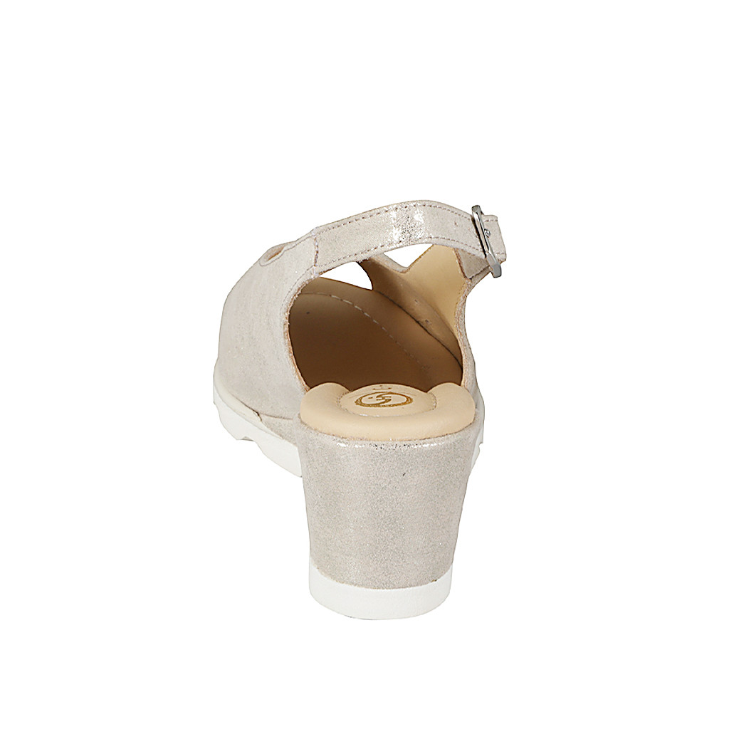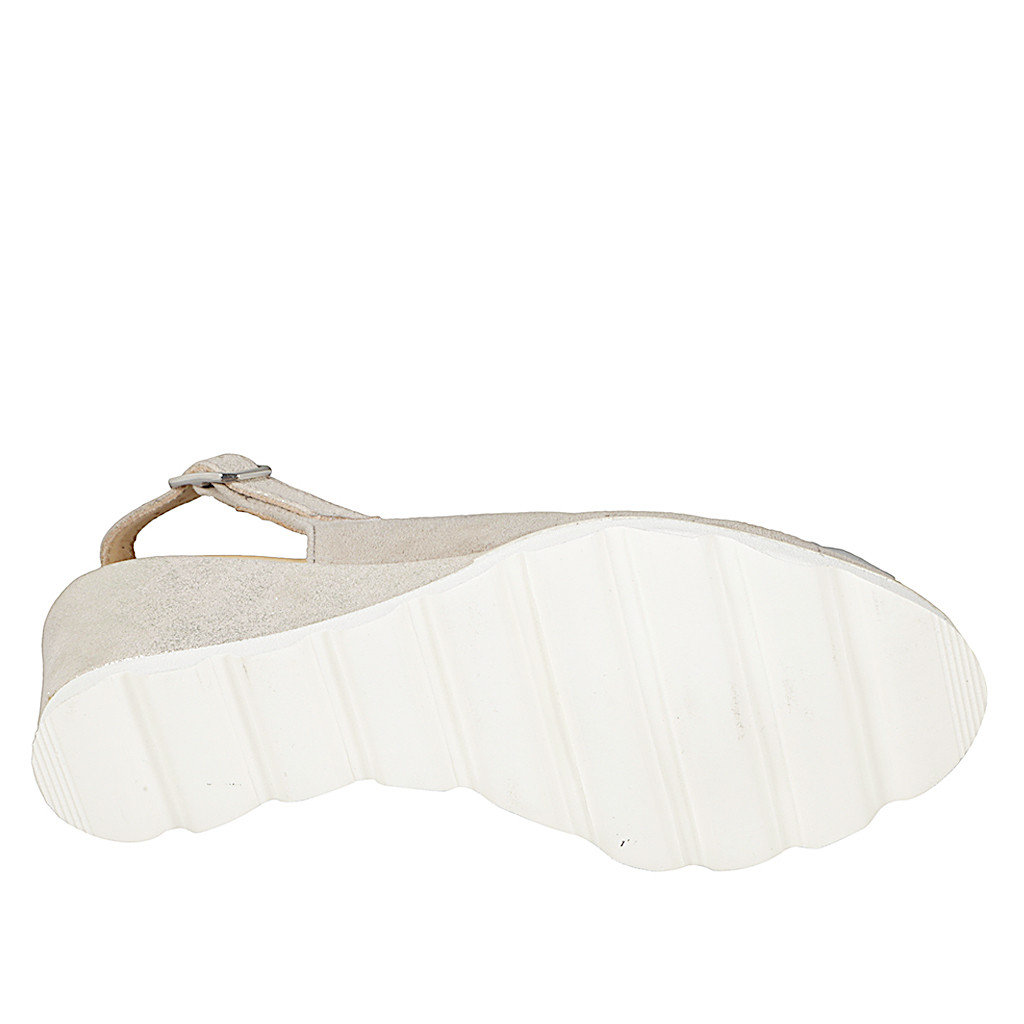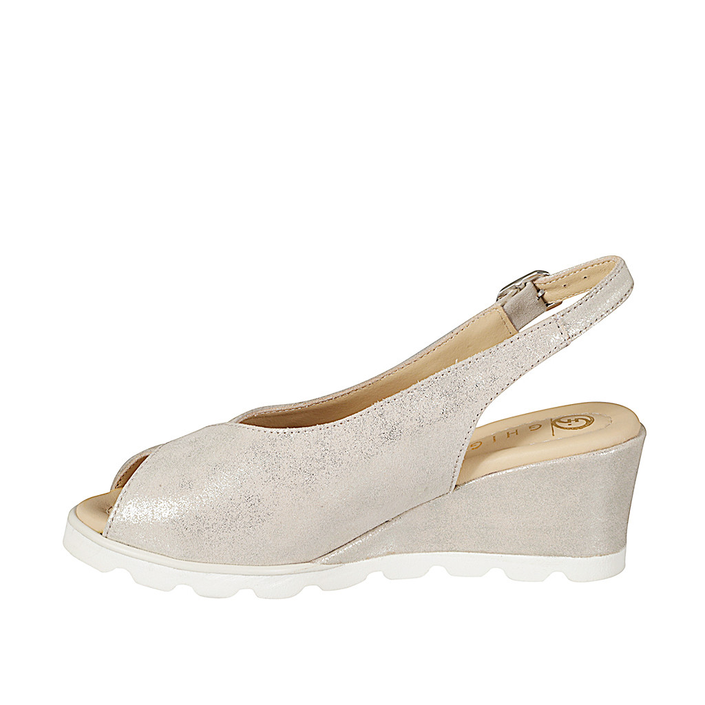 Woman's sandal with an insole in memory foam in pierced beige suede and laminated platinum leather wedge heel 6