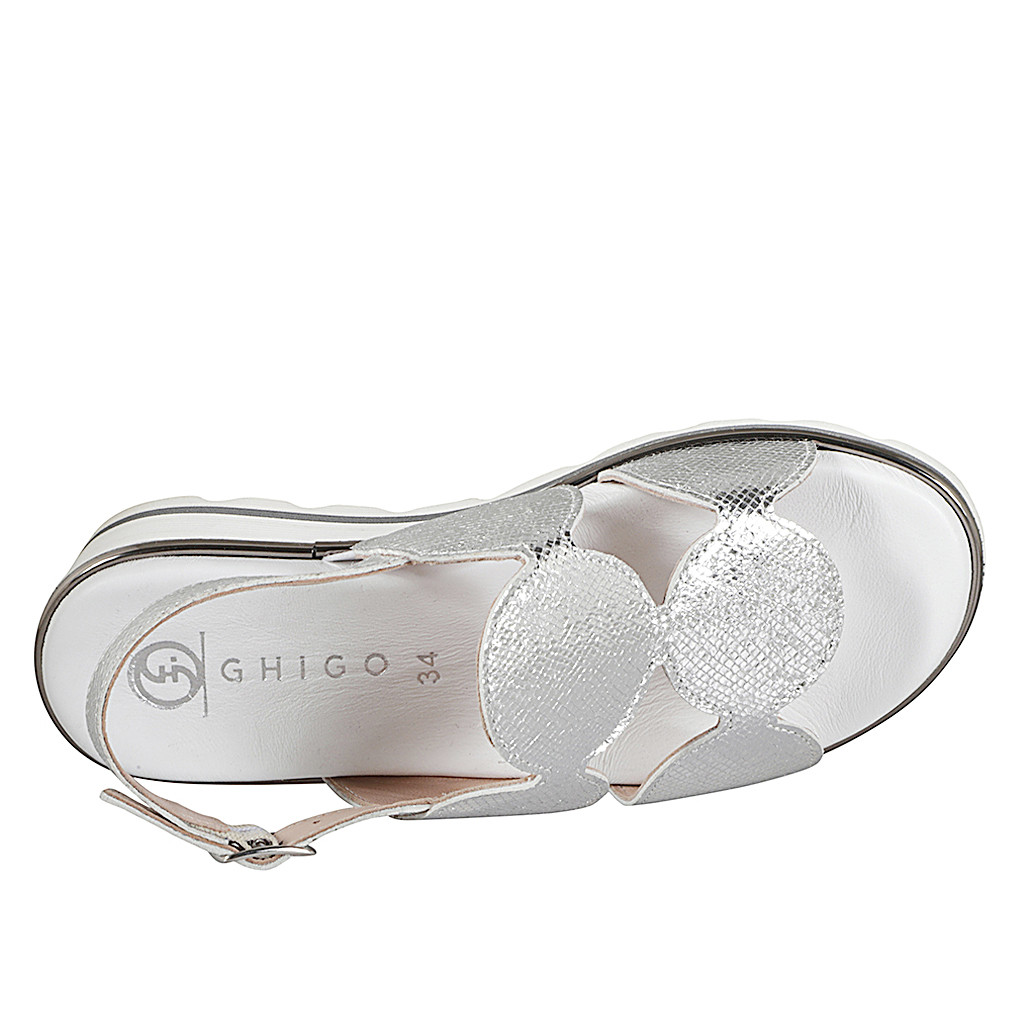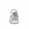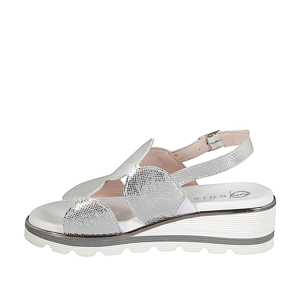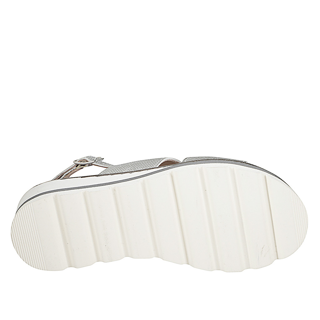 Sandalo da donna con 2 fasce con motivo geometrico ed elastico in pelle laminata argento con zeppa 4