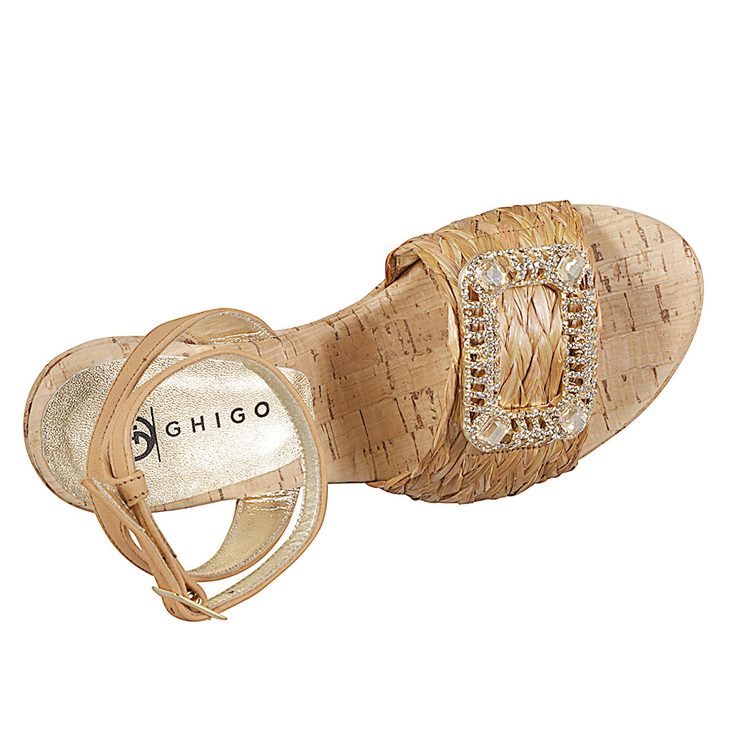 Woman's sandal in cognac raffia and leather with rhinestones and cork wedge 9. Refined and top-quality design!