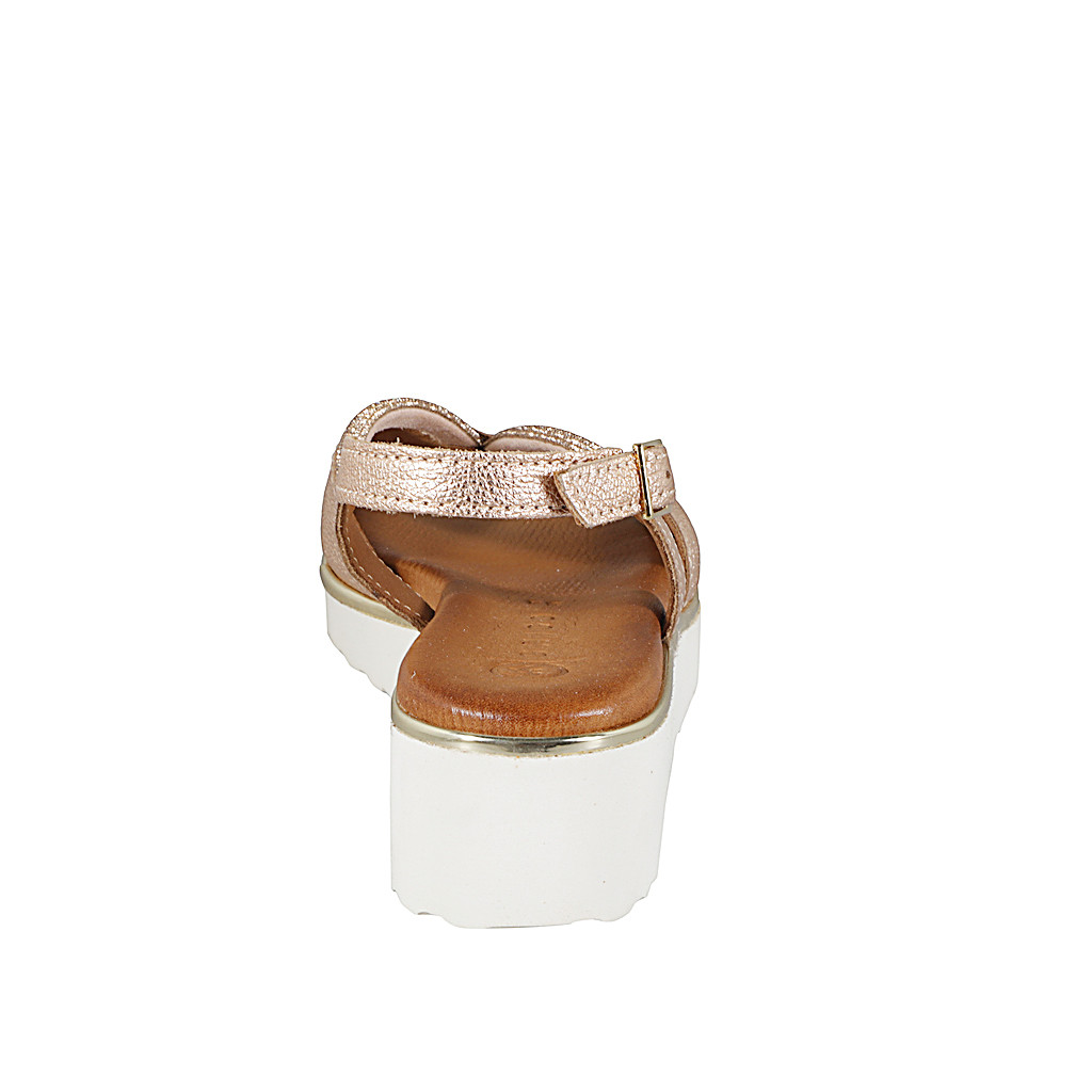 Women's sandal in copper leather and straps with rhinestones and wedge heel 4