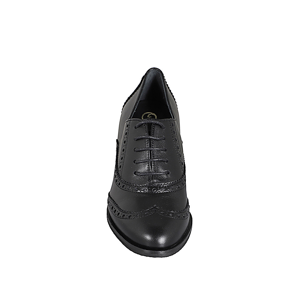 Woman's laced Oxford shoe in black leather with wingtip and heel 5