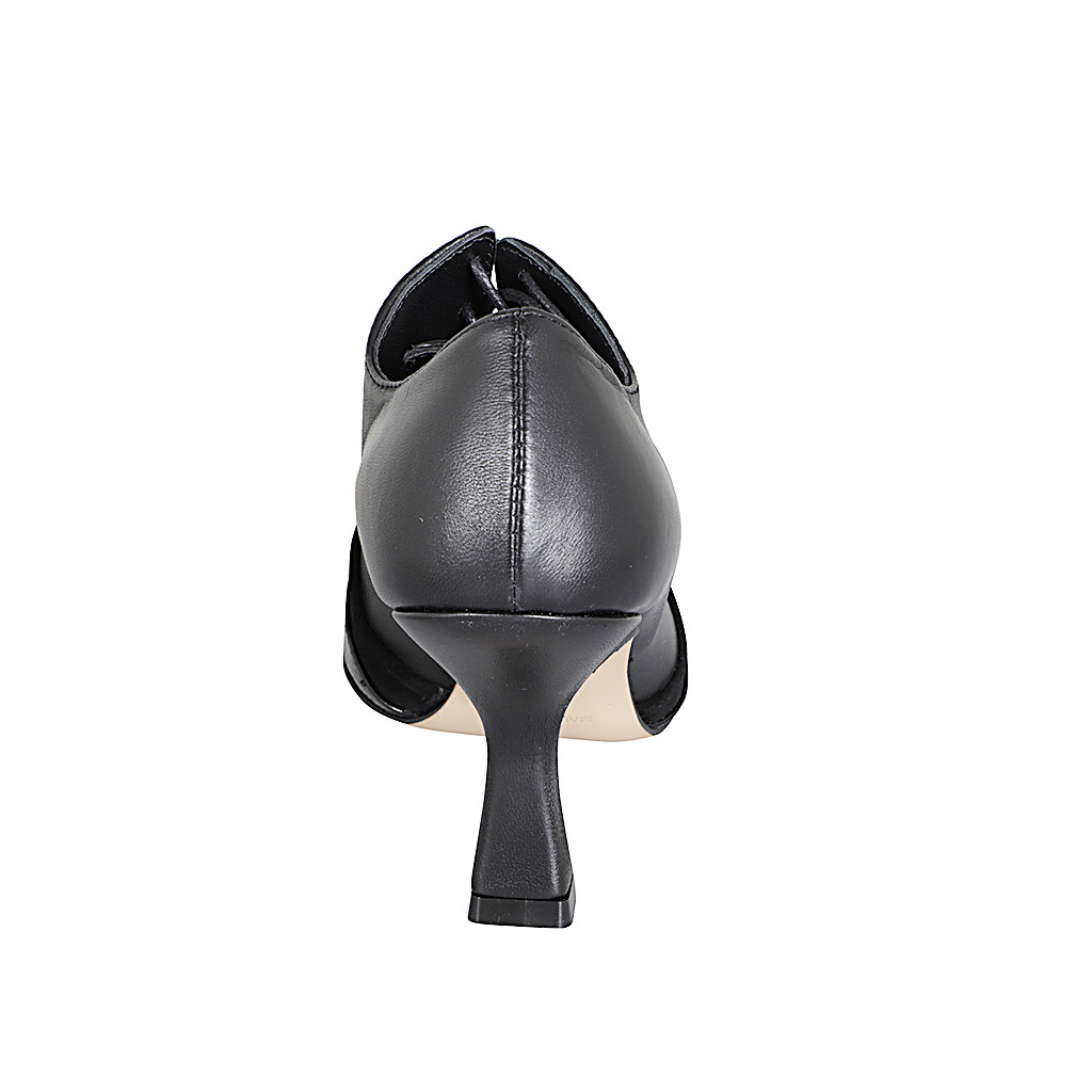 Woman's pointy laced shoe in black leather, suede and patent leather heel 7