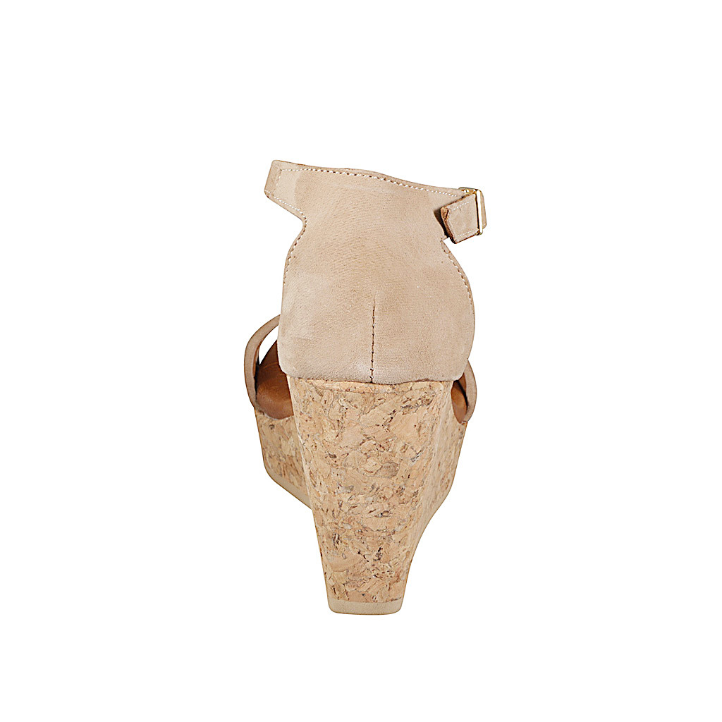Woman's open shoe with platform in tuape suede and drawsrtring fabric with multicolor floral print wedge heel 9