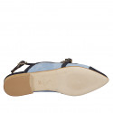 Woman's pointed slingback flat with strap in light blue suede and edges and cap toe in dark blue suede, heel 2