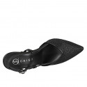 Woman’s pointy slingback in shiny black fabric and black leather heel 9