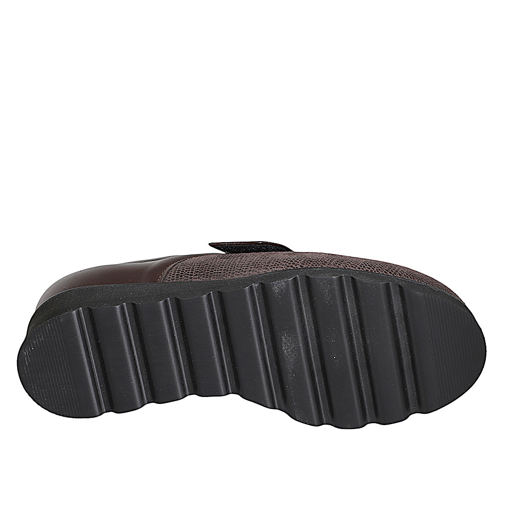 Woman's highfronted shoe with velcro and removable insole in leather and printed stretch dark brown leather wedge 3