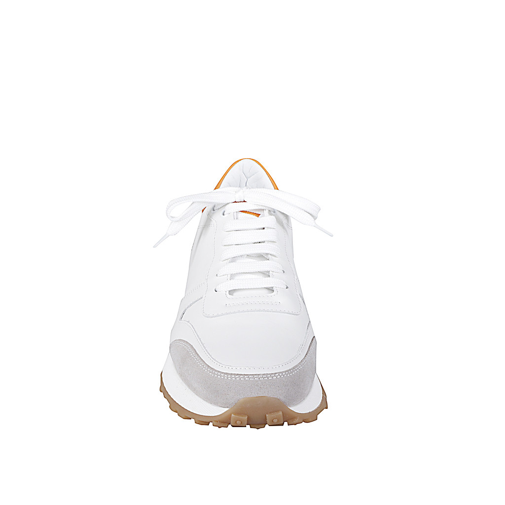 Woman's sneaker shoe with removable insole in white and orange leather and grey suede wedge heel 4