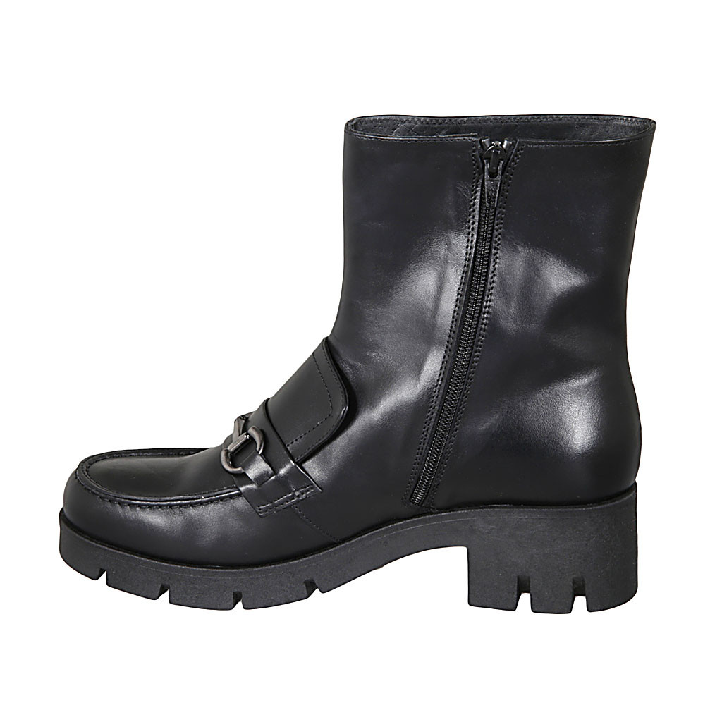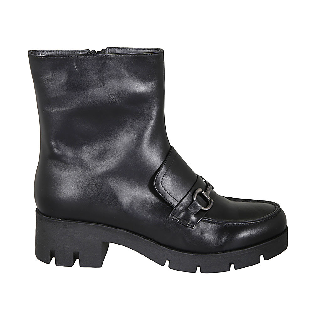 Woman's ankle boot with zipper and accessory in black leather heel 6