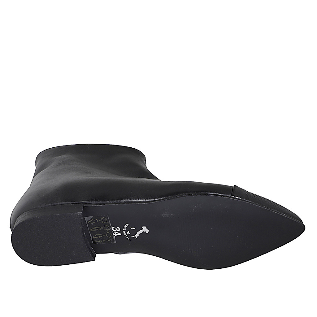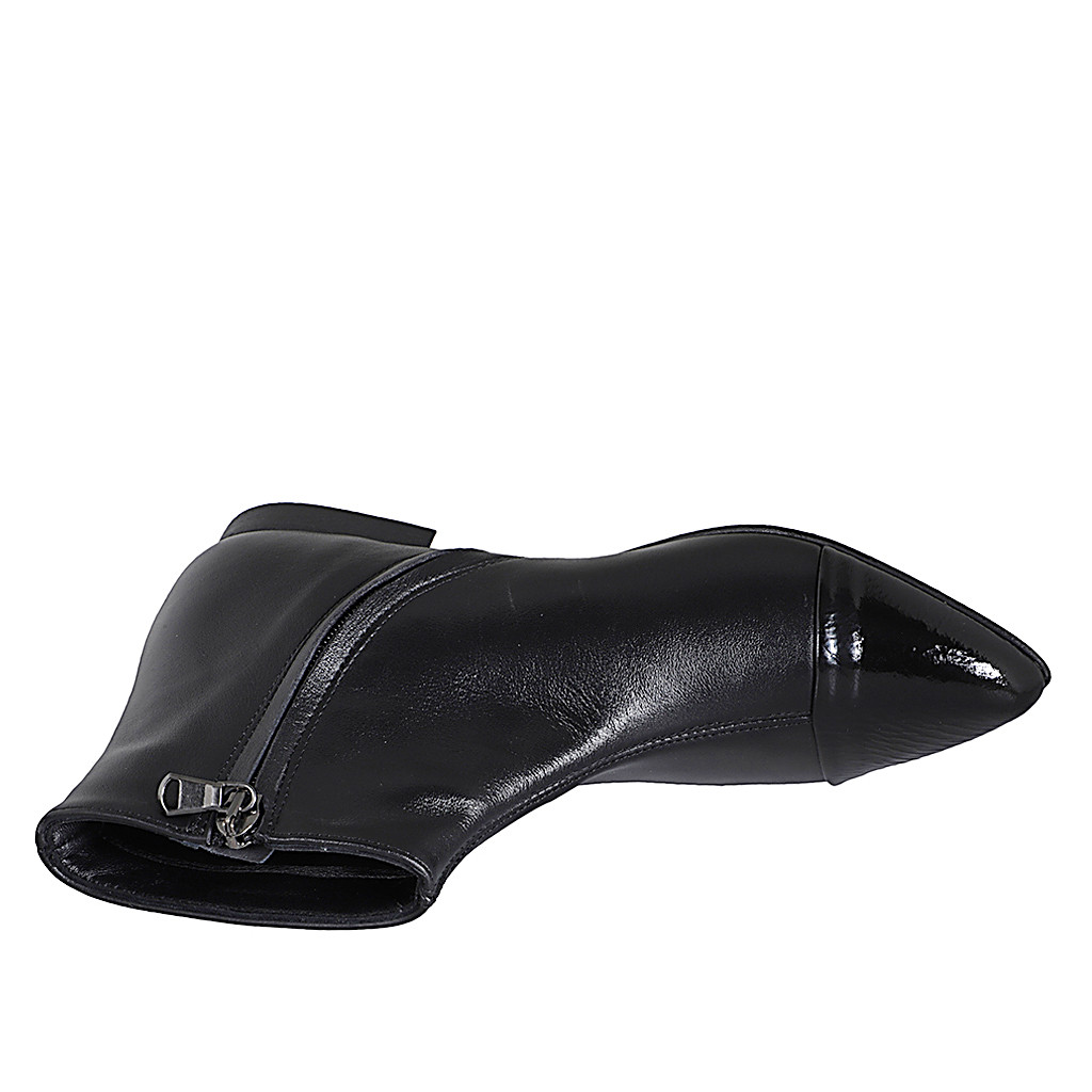 Woman's ankle-high boot with pointy toe and inner zip in black leather and black patent leather captoe heel 2