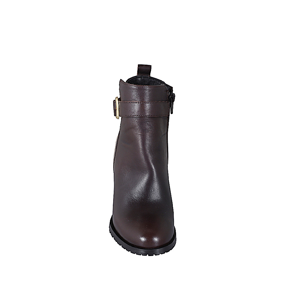 Woman's ankle boot in dark brown leather with zippers, buckle and round tip heel 7