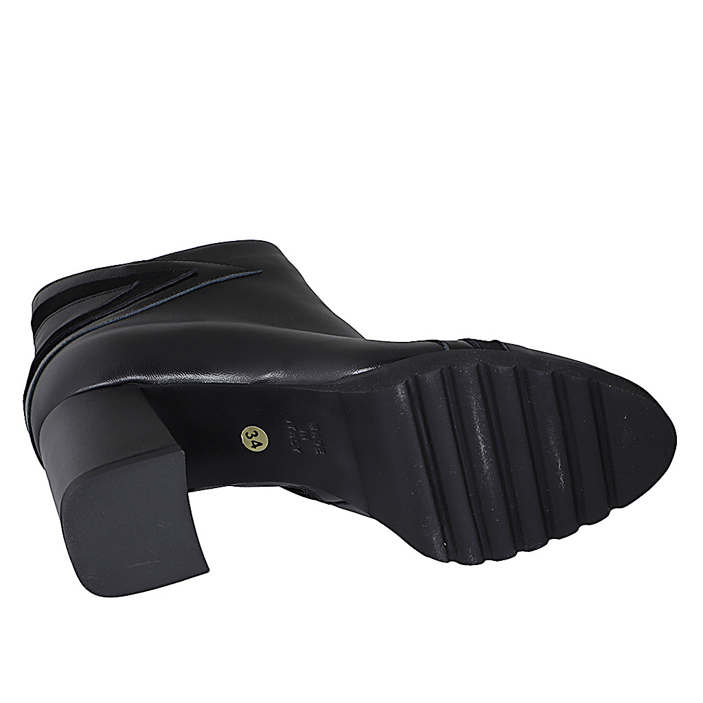 Woman's ankle boot with zipper in black leather, suede and patent leather heel 7